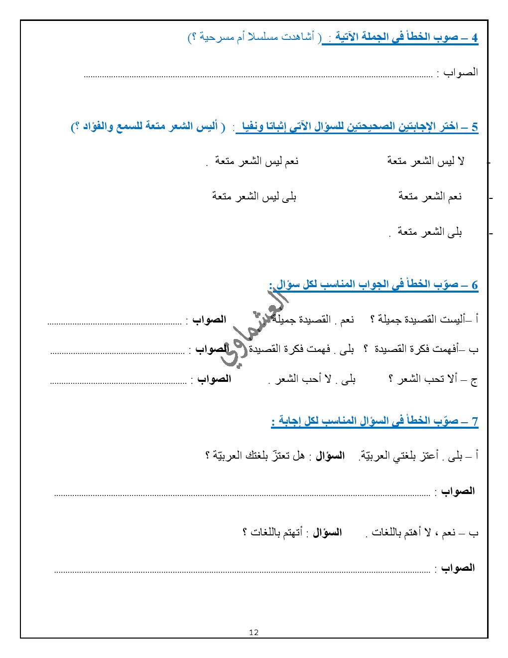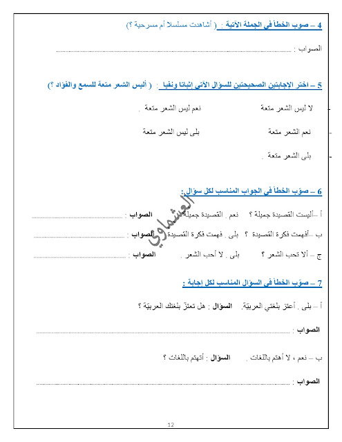 6. لغة عربية, الفصل الأول, 2025-2026, نموذج اختبار قصير أول من العشماوي
