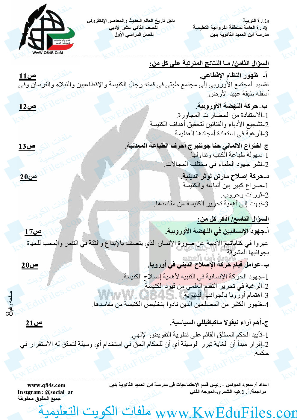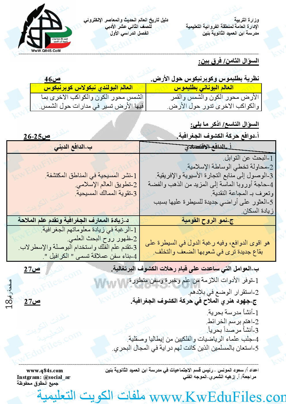 الصف الثاني عشر الأدبي - الفصل الاول من العام الدراسي 20182019 وفق المنهاج الكويتي