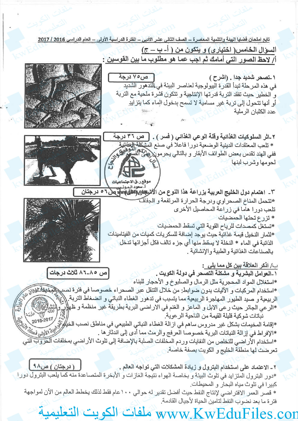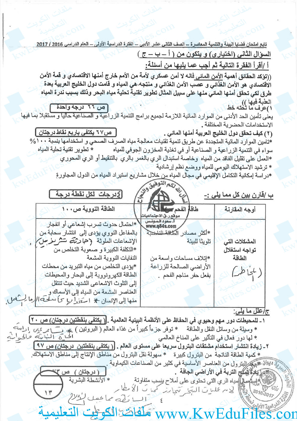 نموذج اجابة امتحان الفترة الاولى 20162017, التوجيه الفني العام للاجتماعيات, الصف الثاني عشر الأدبي, جغرافيا, الفصل الأول, 2018-2019 - المناهج الكويتية