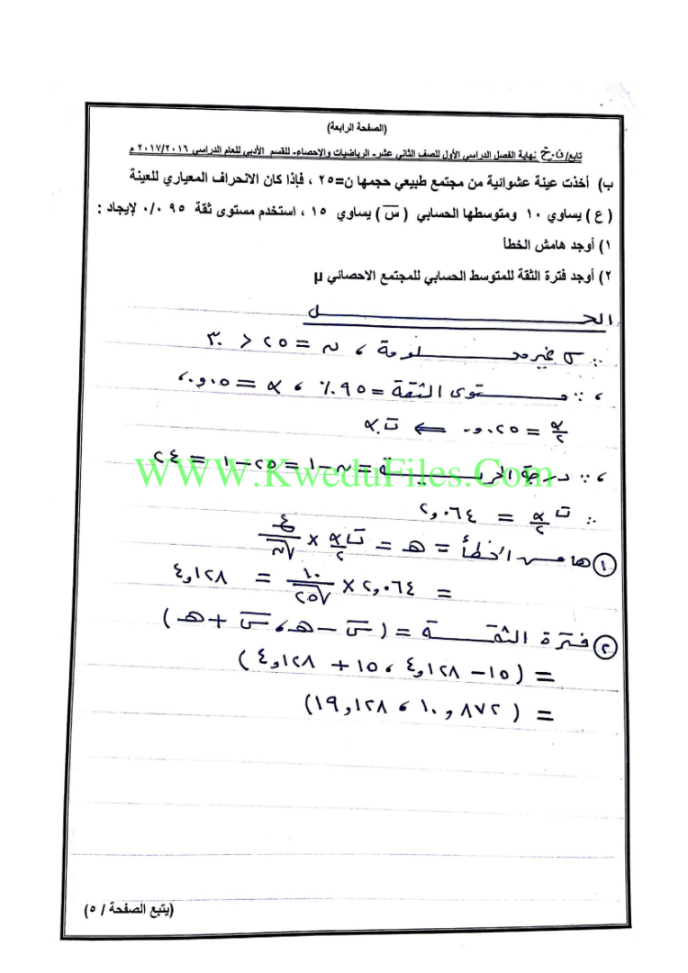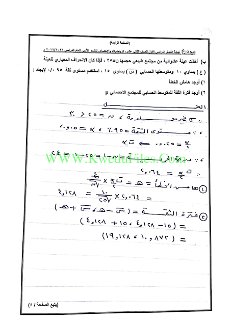 نموذج اجابة اختبار في مادة الإحصاء للصف الثاني عشر للكورس الاول عدد اوراق هذا الملف 7اوراق