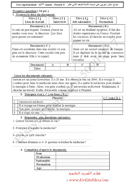 معلومات الملف: نموذج تجريبي في مادة اللغة الفرنسية للصف الثاني عشر للفصل الدراسي الثاني عدد اوراق هذا الملف 4 اوراق ويتضمن نموذج تجريبي للوحدة الثامنة | ||