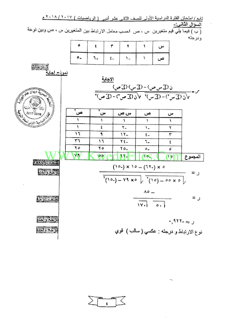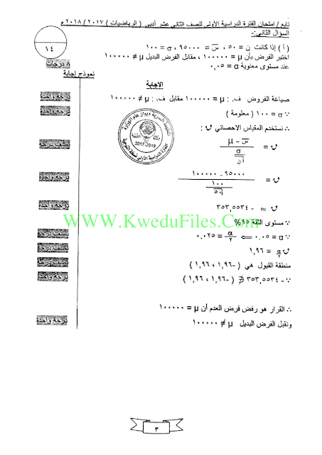 12. إحصاء, الفصل الثاني, 2024-2025, نموذج إجابة الاختبار النهائي الرسمي المعتمد من التوجيه الفني العام