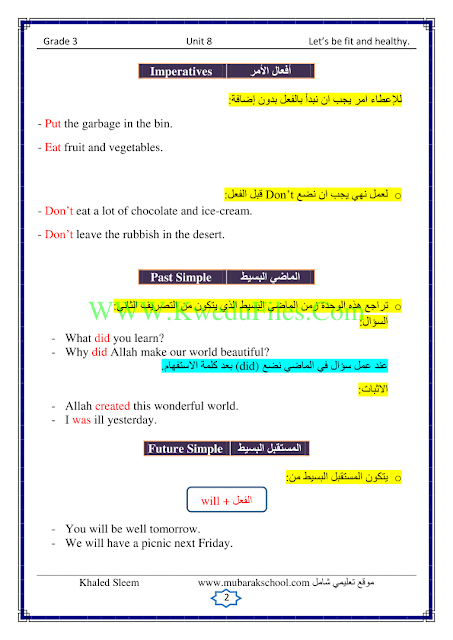 6اوراق في مادة اللغة الانكليزية للصف الثالث للكورس الثاني تتضمن الوحدة الثامنة