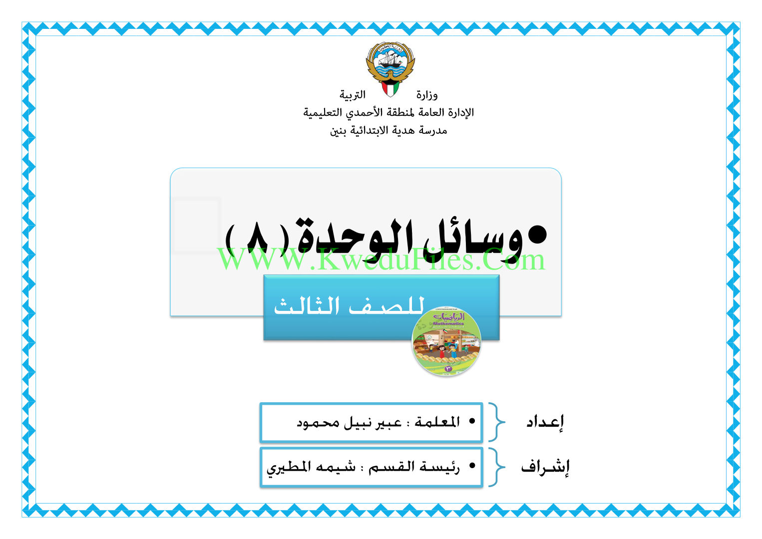 وسائل الوحدة الثامنة 2018/2019في مادة الرياضيات للصف الثالث للكورس الثاني عدد اوراق هذا الملف 140ورقة مع العلم ان صور الملف ادناه لاتحتوي الا على جزء من محتوى الملف الذي ستجده كاملا" عند تحميله