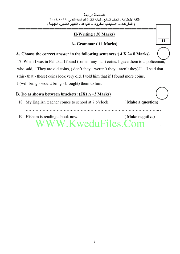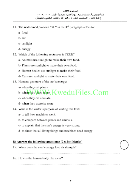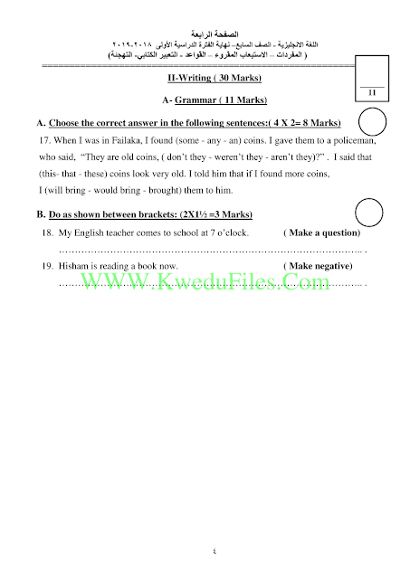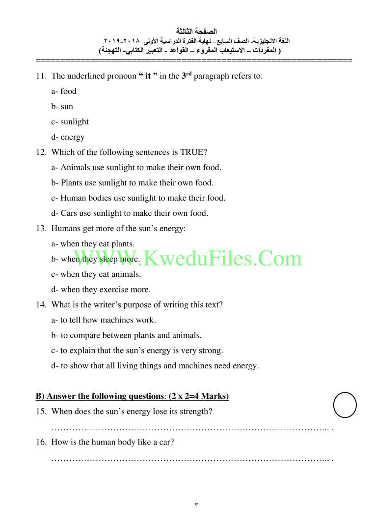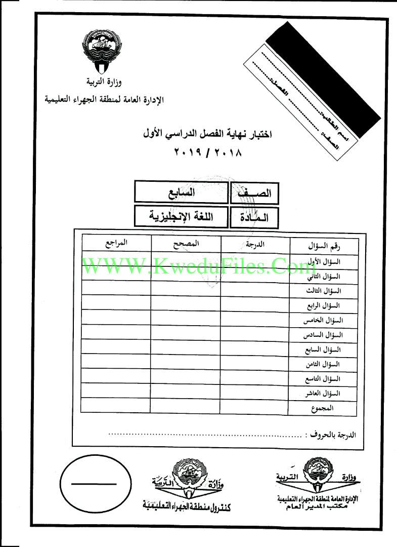 أنت هنا: موقع المناهجالمناهج الكويتية الصف السابع لغة انجليزية الفصل الأول الامتحان النهائي