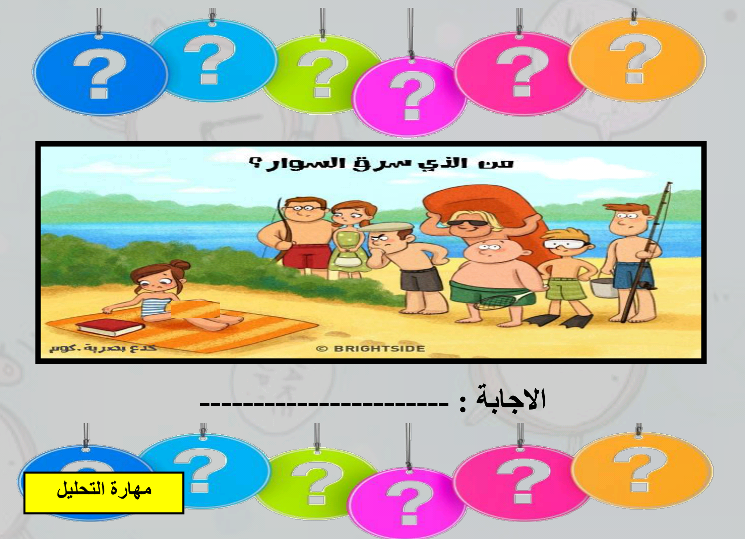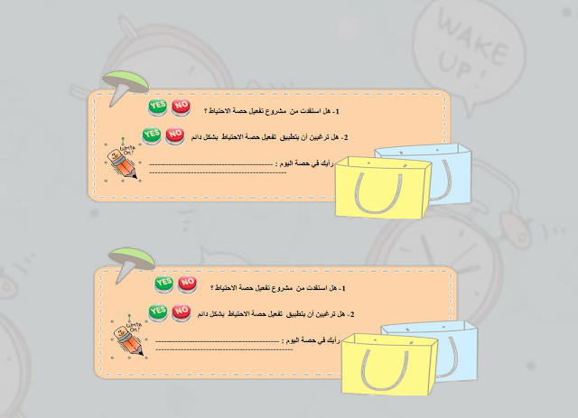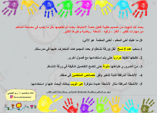 معلومات الملف: لله الحمد والمنة انتهيت من تصميم نموذج تفعيل حصة الاحتياط نحو الاستغلال الأمثل للوقت المهدور - الترفيه وفق مهارات التفكير العليا تحتوي الحقيبة على أنشطة ترفيهية تم تطعيمها بمهارات التفكير العليا بغرض دمج الترفيه و الاستفادة معاً. كل ما عليك أخي المعلم ، أختي المعلمة هو الآتي: 1- سحب عدد 5 نسخ لكل (ورقة نشاط) أو بعدد المجموعات المتعارف عليها في مدرستك. 2- تغليفها تغليفاً حرارياً حتى يتم استخدامها مع فصول أخرى. 3- من الضروري طباعتها ملونة حتى تتضح التفاصيل الدقيقة في ورقة النشاط. 4 - الأنشطة المرفقة قابلة للتغير وفق خصائص المتعلمين في صفك. 5- الأنشطة المرفقة مثال لأنشطة عديدة متوفرة عبر الويب يمكنك البحث عنها و استخدامها. في المرفق كذلك الأوراق الآتية : 1- غلاف الحقيبة مفرغ بخانة الاسم لكتابة اسم المعلم. 2- فهرس على أشكال حقائب، لمحتويات حقيبة تفعيل حصة الاحتياط 3- ورقة النجمة حتى يتم رصد نقاط ممارسة الأنشطة بالفصل. أرجو من الله تعالى أن يتقبل هذا العمل كصدقة عِلم لجميع المسلمين و لوالدي و تصميم / أ. ريم العجمي ☁ رئيسة القسم / أ. اقبال المطيري ☁ الموجهة الفنية / أ. فهده السعيدي ☁مديرة المدرسة / د. شيخة العيسى أسأل الله التوفيق و السداد | ||