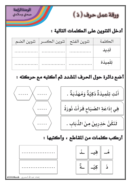 الوحدة الأولى (صحتي وسلامتي)اوراق عمل لحرف (ذ)