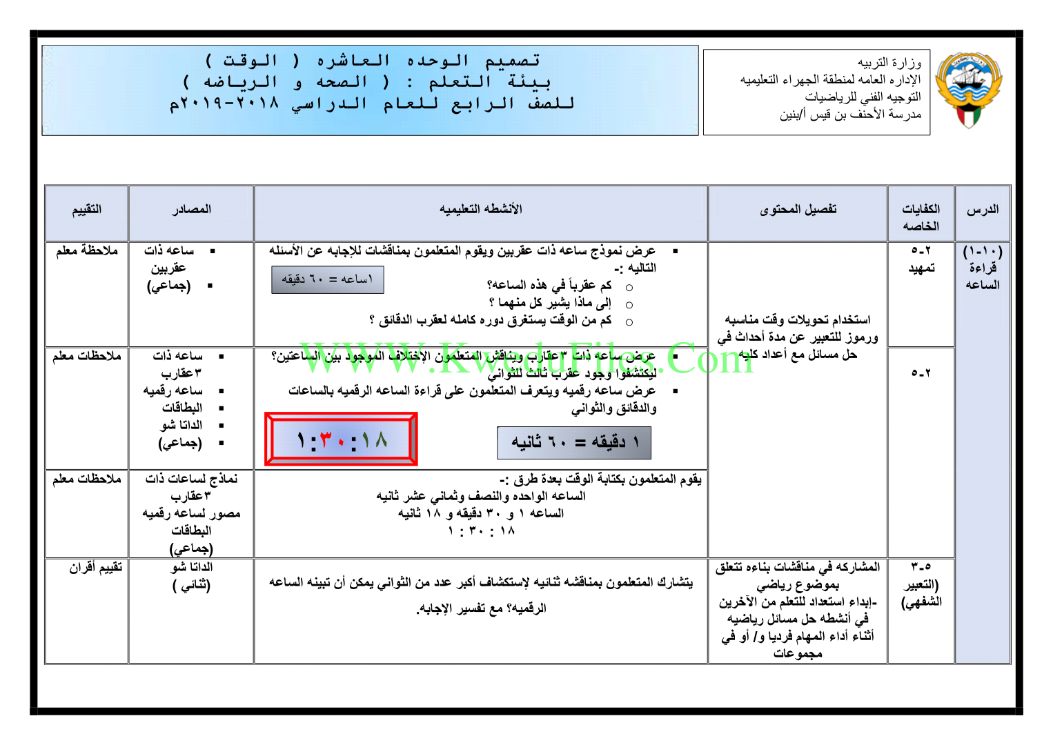 معلومات الملف: 11ورقة في مادة الرياضيات للصف الرابع للكورس الثاني تتضمن تصميم الوحدة العاشرة | ||