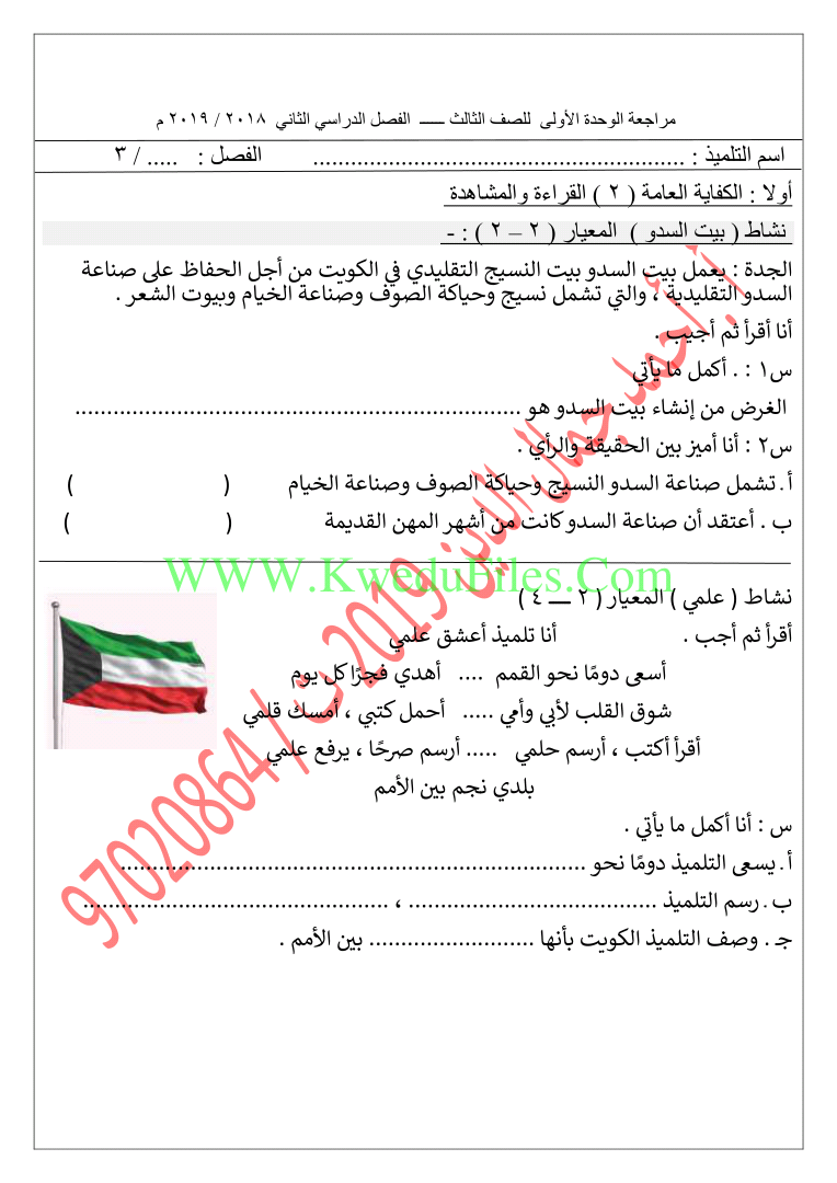 15. اجتماعيات, الفصل الأول, 2025-2026, أوراق عمل على درس التراث الكويتي مع الوعي البيئي والاجتماعي