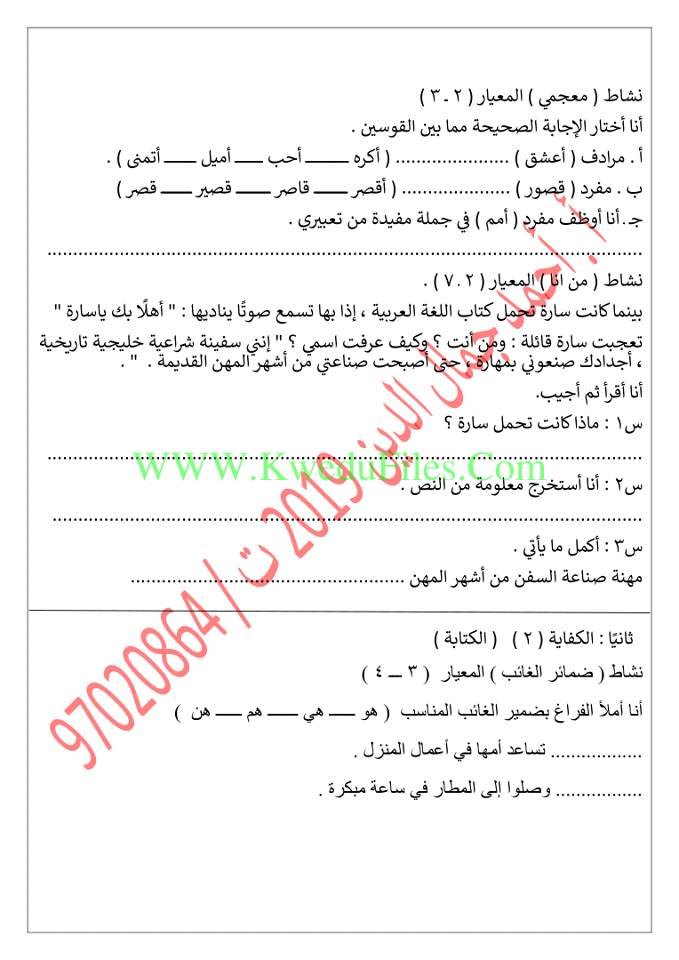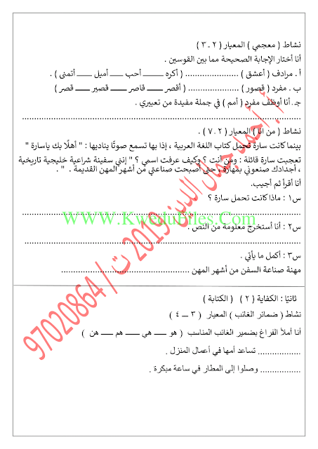 7, الصف الأول, لغة عربية, أوراق عمل على الاختبار القصير الأول