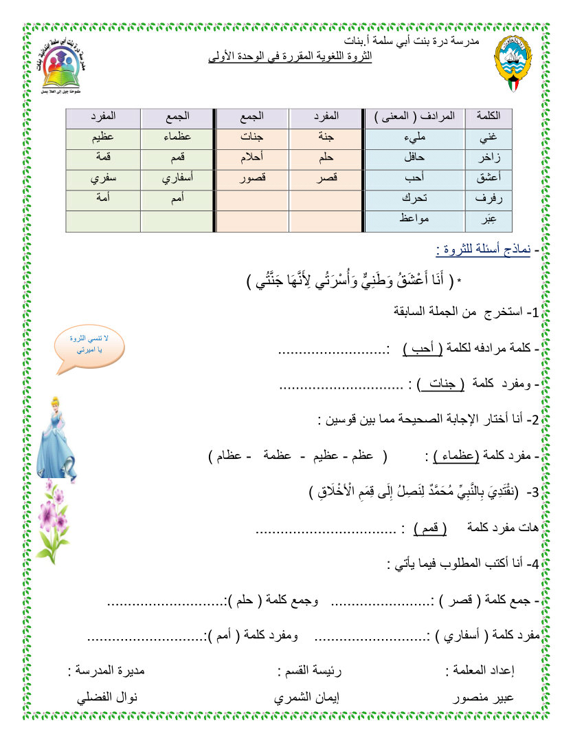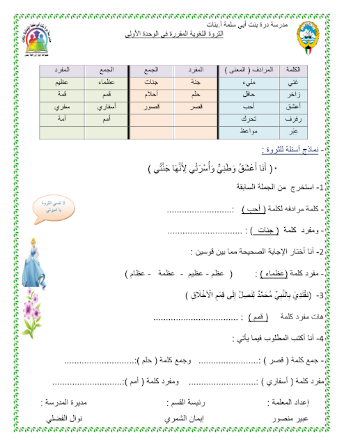 إليكم الثروة اللغوية للوحدة الاولى في مادة اللغة العربية للصف الثالث للكورس الثاني