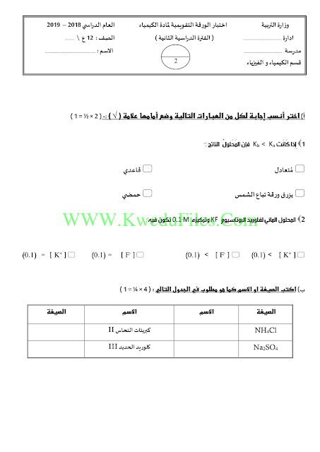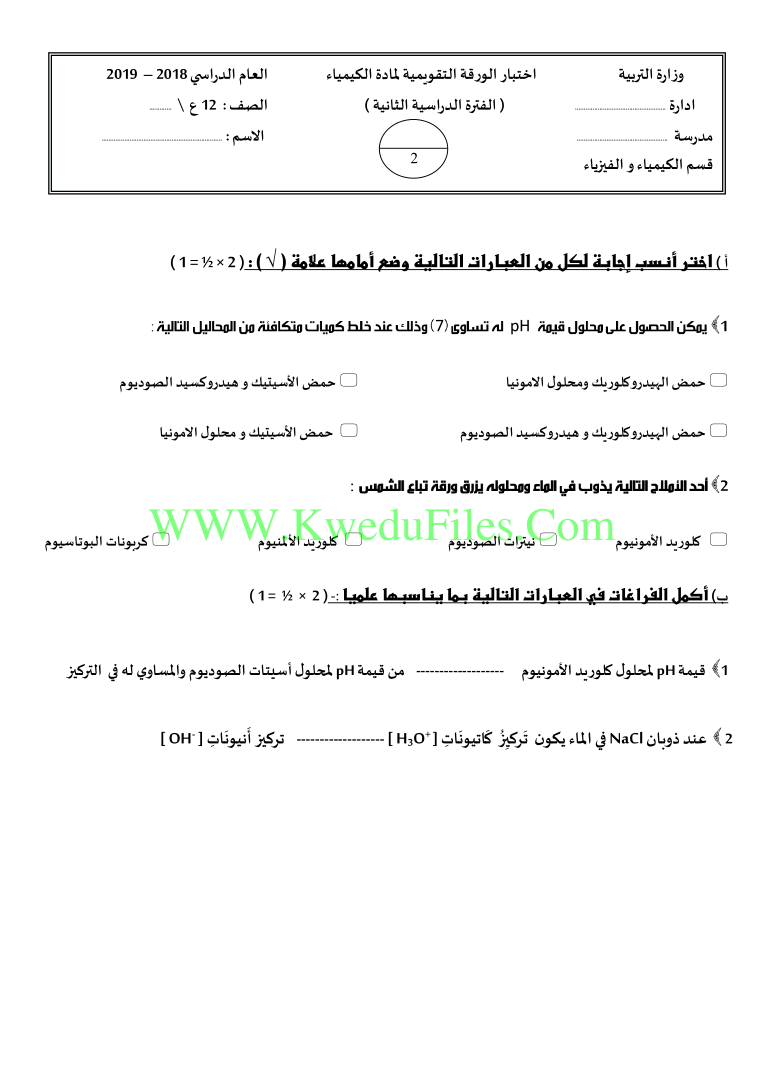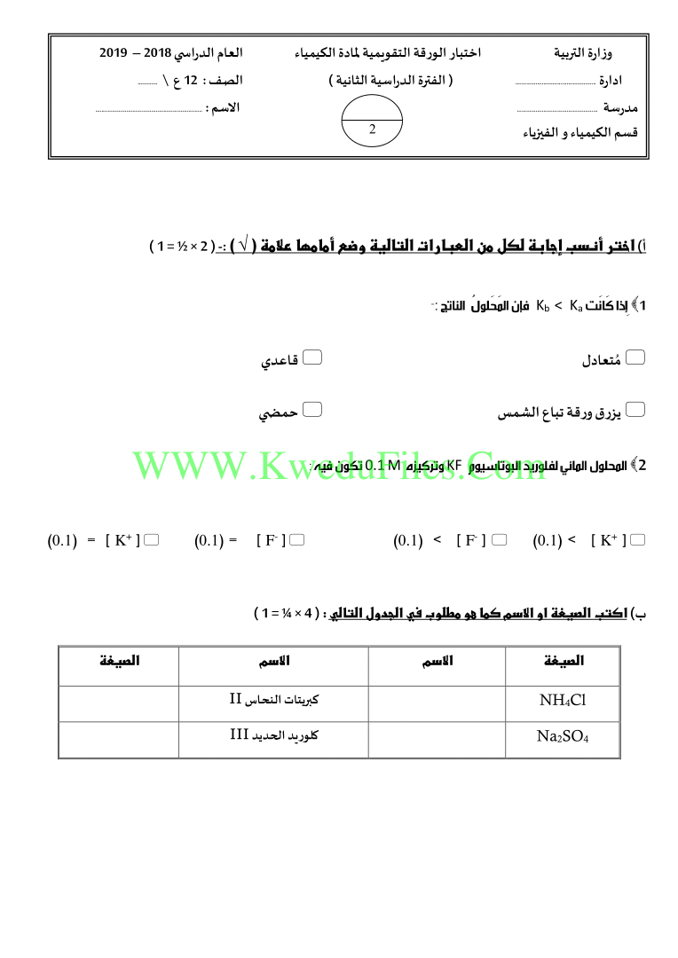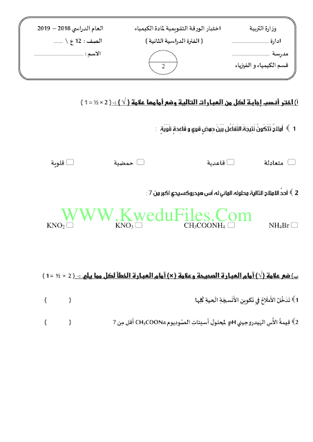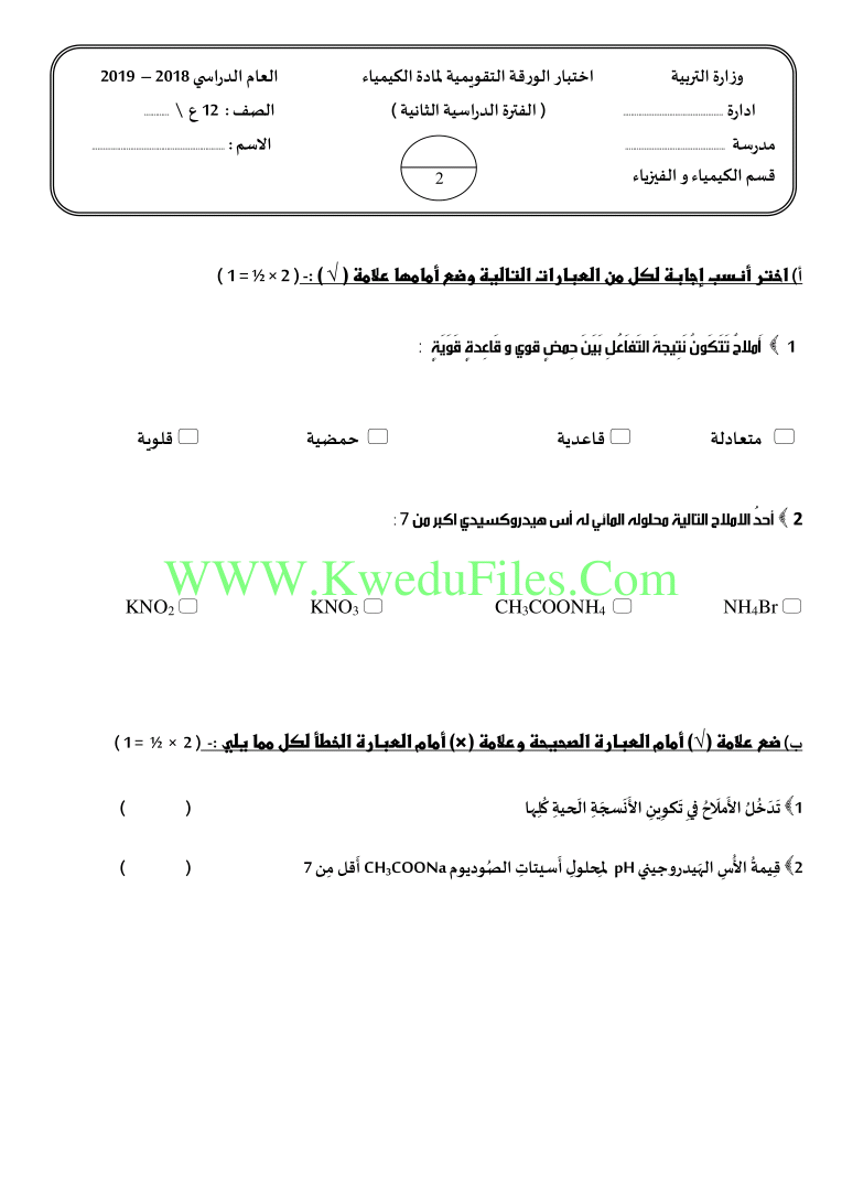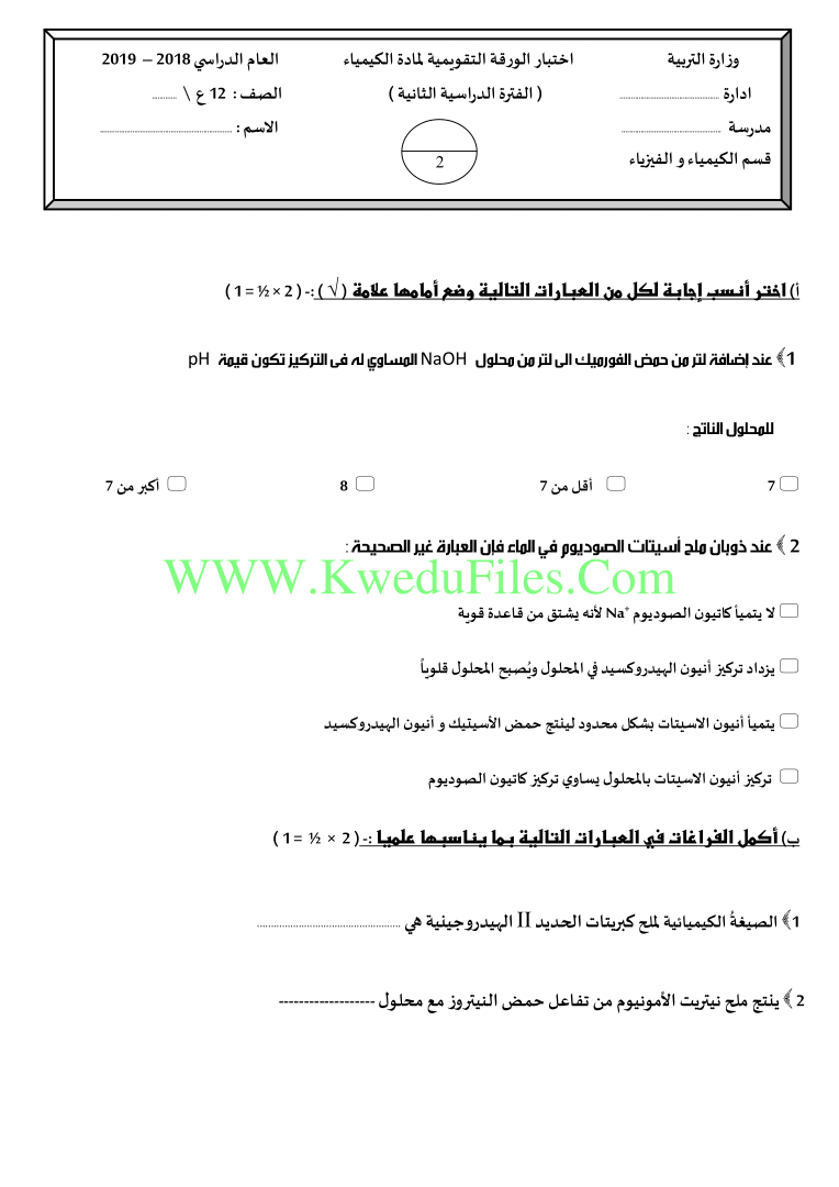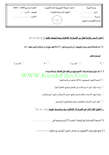معلومات الملف: اليكم اختبار الورقة التقويمية في مادة الكيمياء للصف الثاني عشر العلمي للكورس الثاني | ||