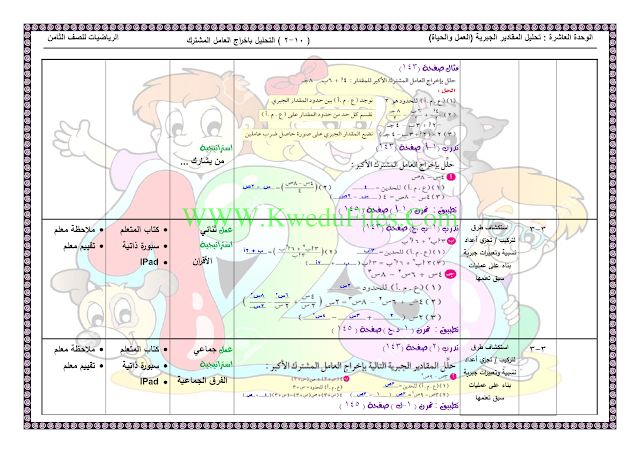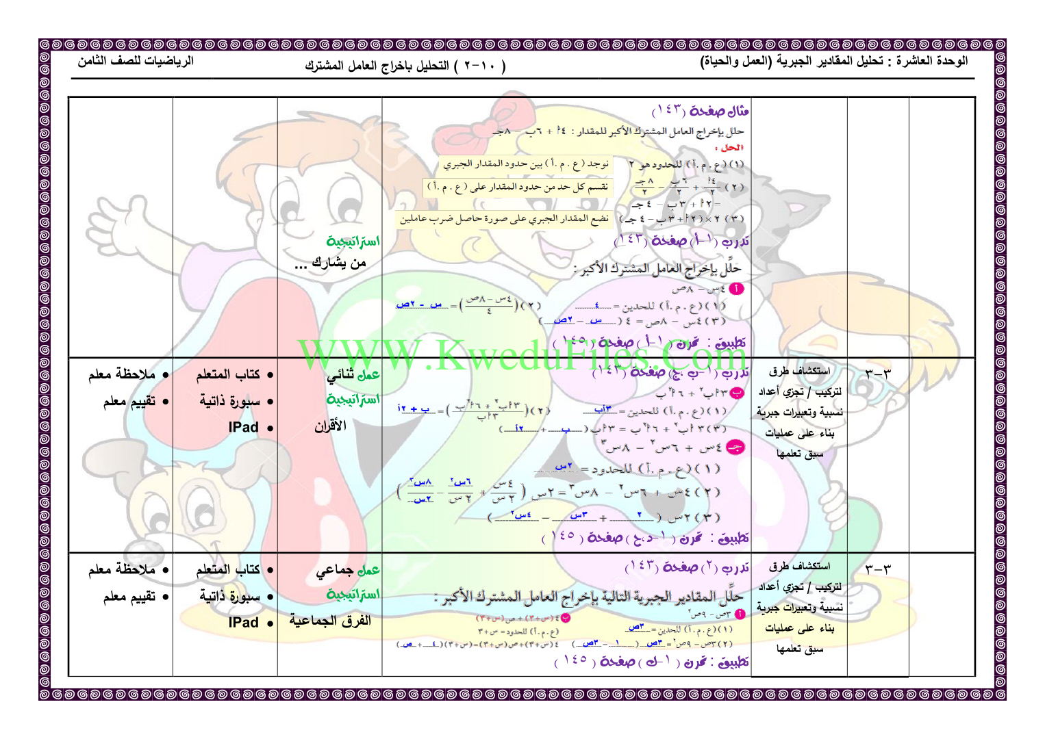 3اوراق في مادة الرياضيات للصف الثامن للكورس الثاني تتضمن التحليل بإخراج العامل المشترك