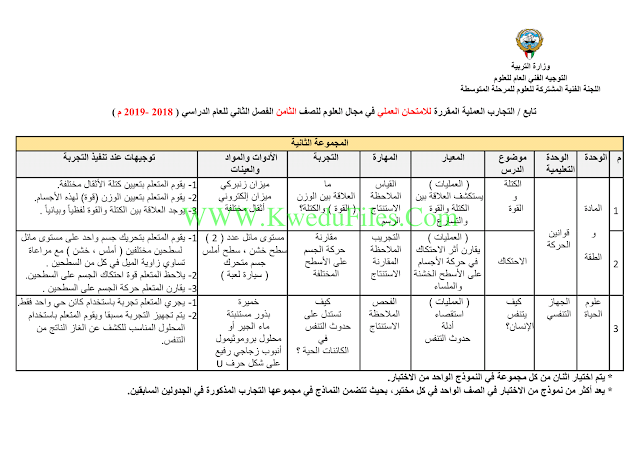 6اوراق في مادة العلوم للصف الثامن للكورس الثاني تتضمن التجارب العلمية للاختبار العملي