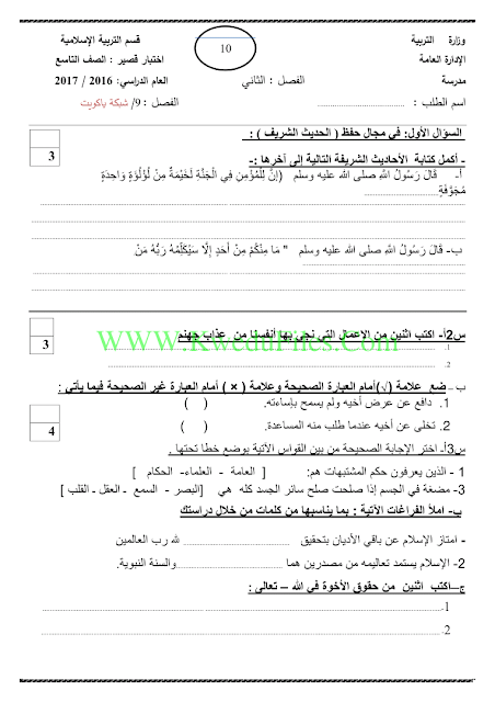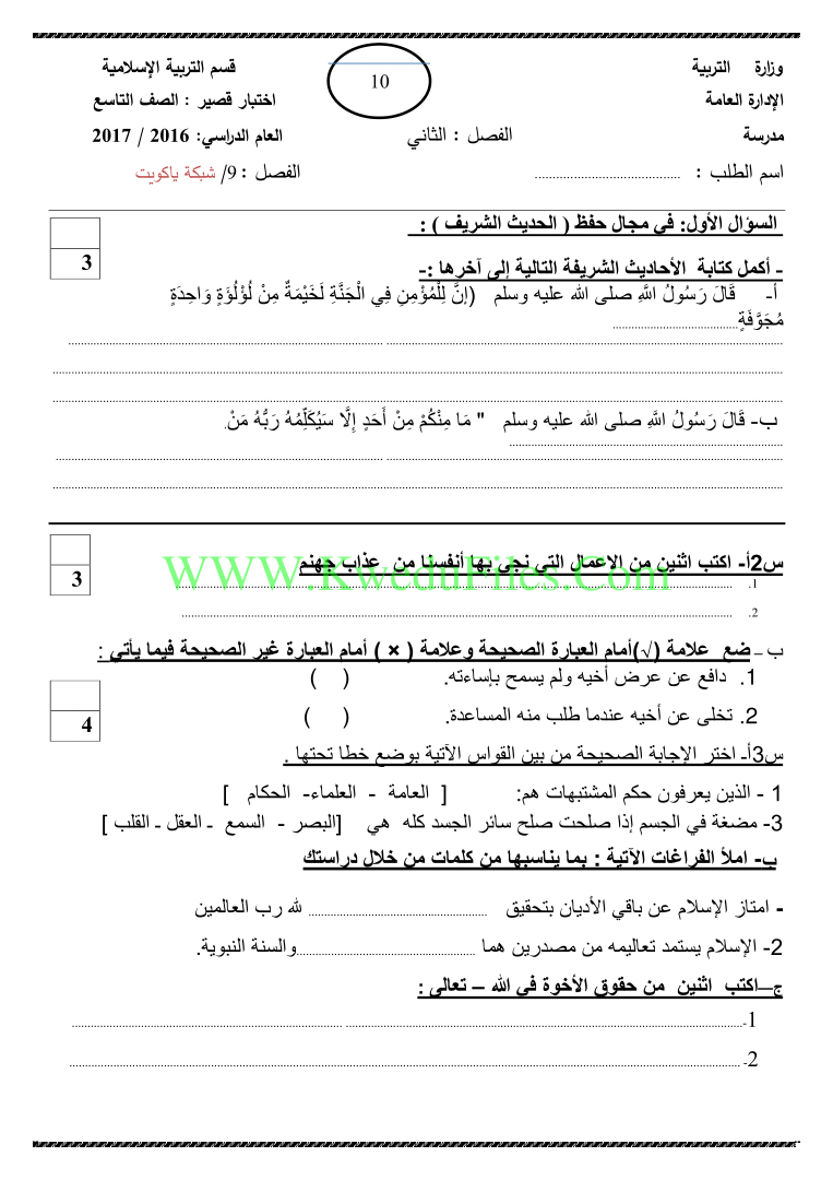 اليكم نموذج اختبار قصير في مادة التربية الاسلامية للصف التاسع للكورس الثاني