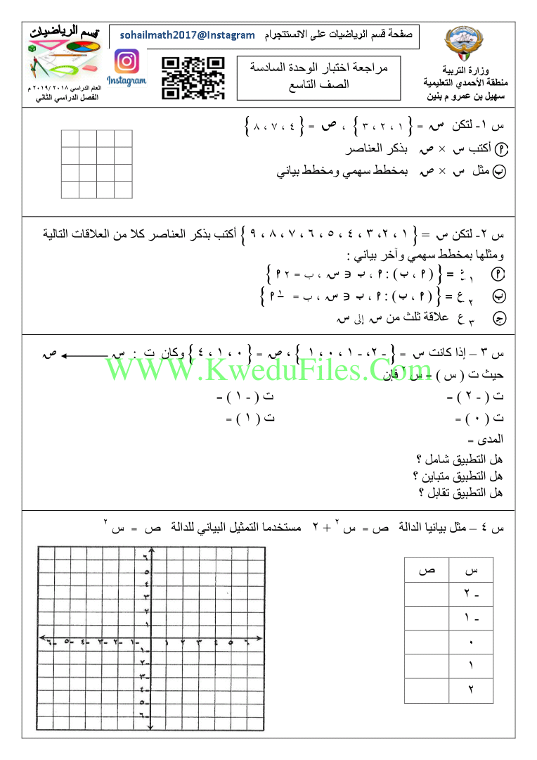 | معلومات الملف: اليكممراجعةاختبار الوحدة السادسة في مادة الرياضيات للصف التاسع للكورس الثاني | ||