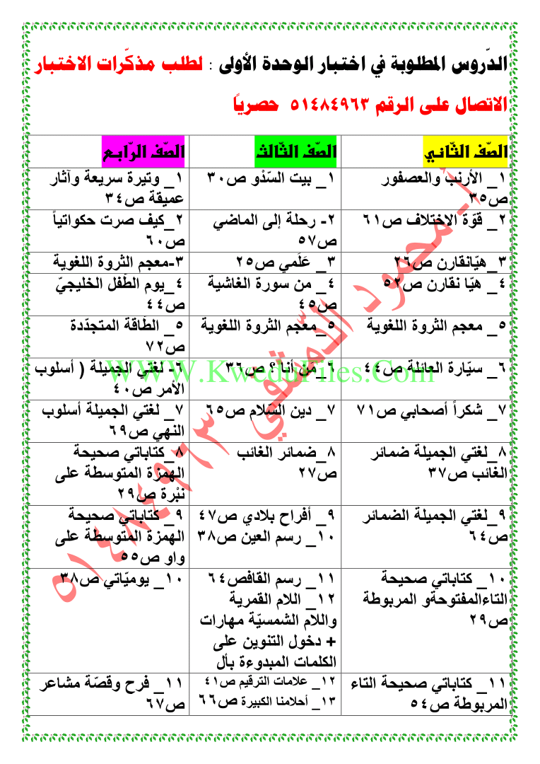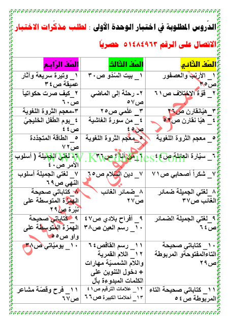اليكم الدروس المطلوبة للاختبار الاول في مادة اللغة العربية للصفوف 4/3/2
