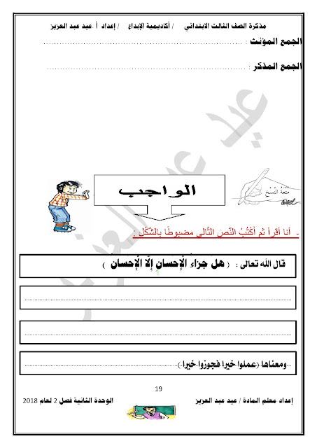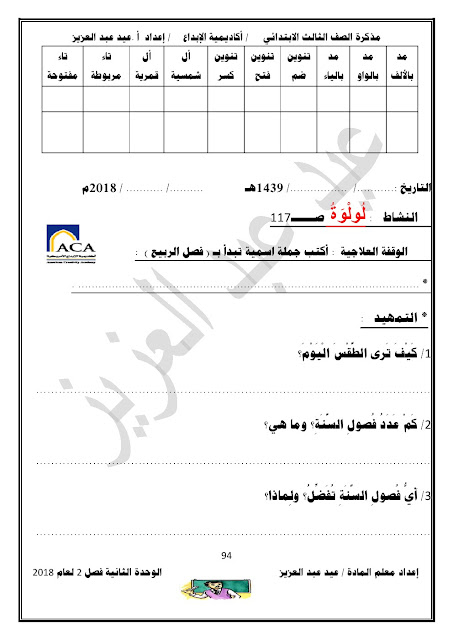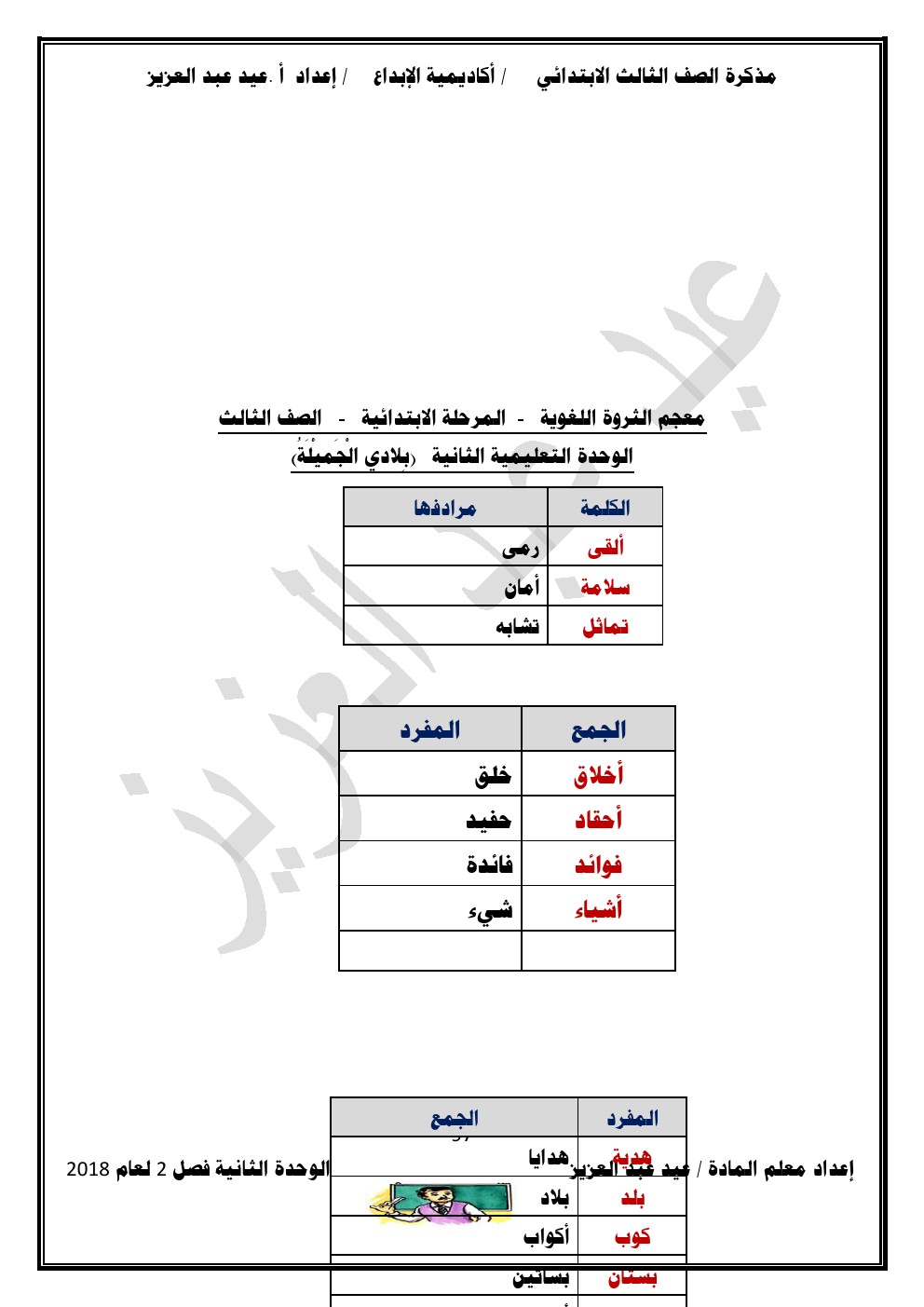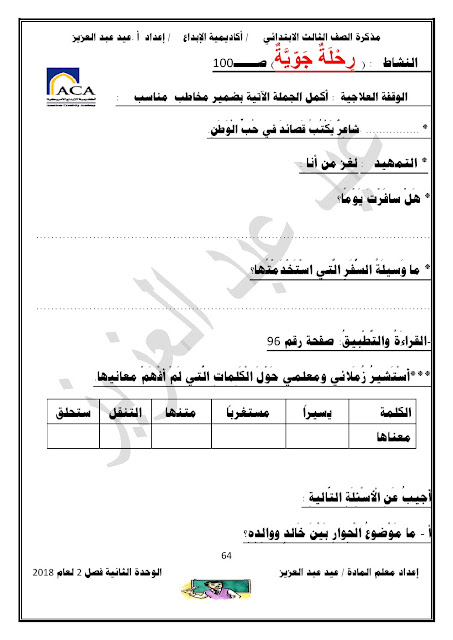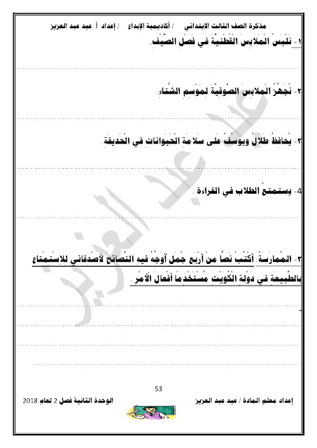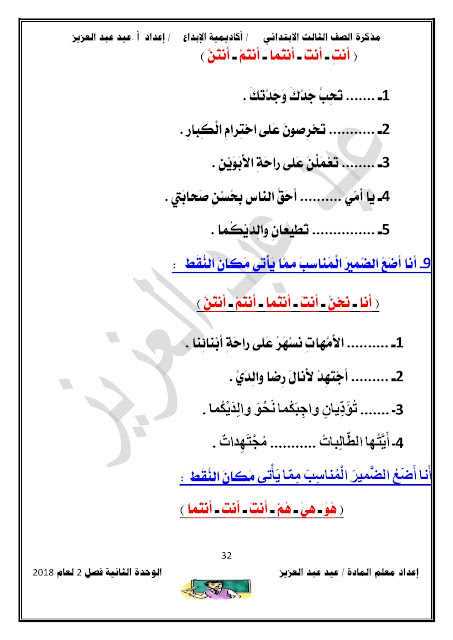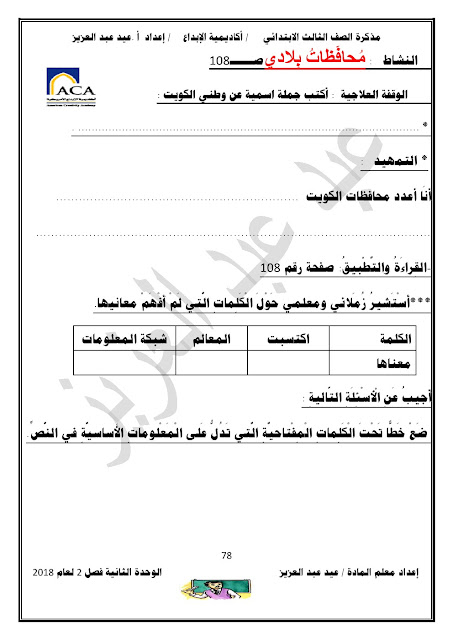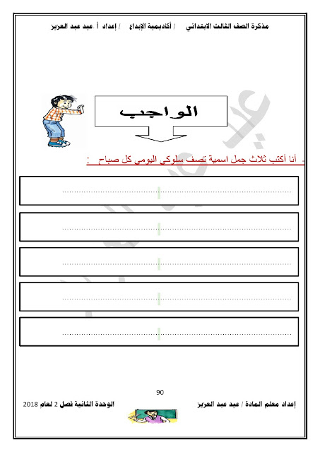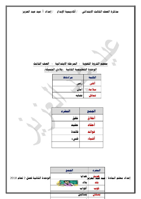يحتوي الملف على الوحدة الثانية في مادة اللغة العربية للصف الثالث الابتدائي عدد اوراق هذا الملف 98 ورقة للاستاذ عيد عبد العزيز محمد ويتضمن الملف الوحدة الثانية