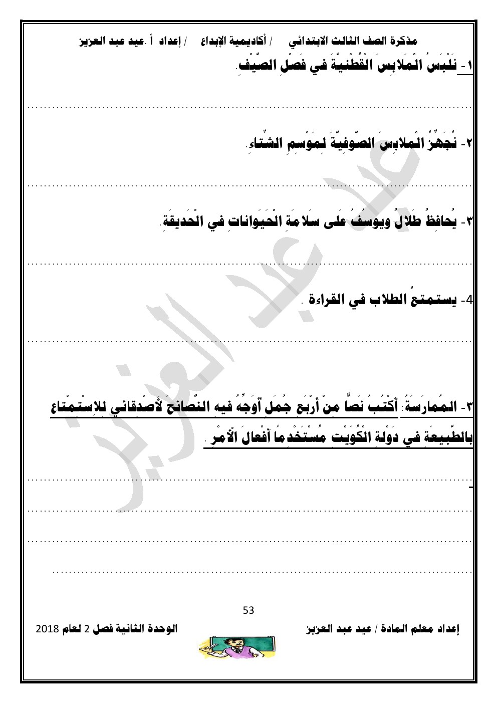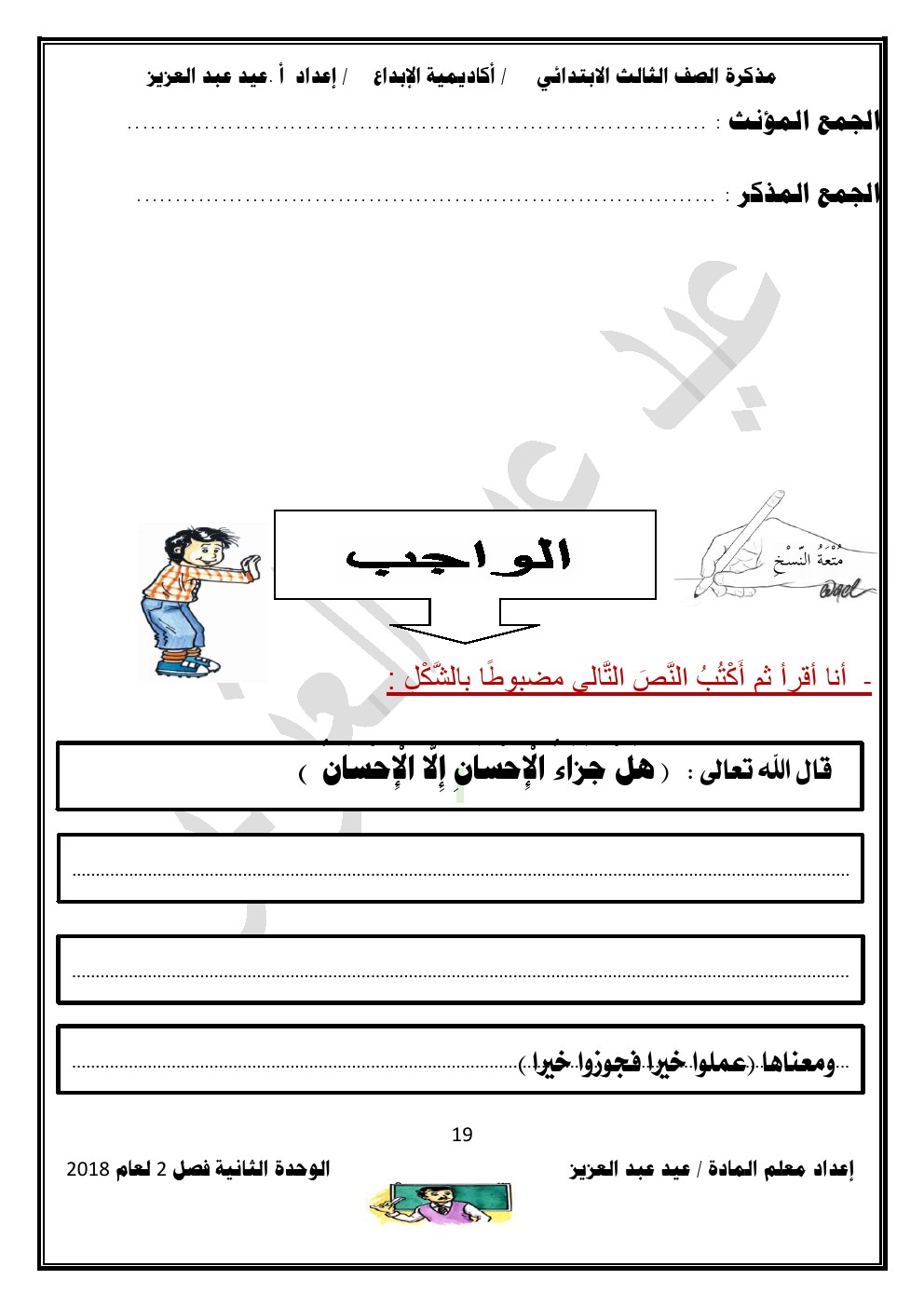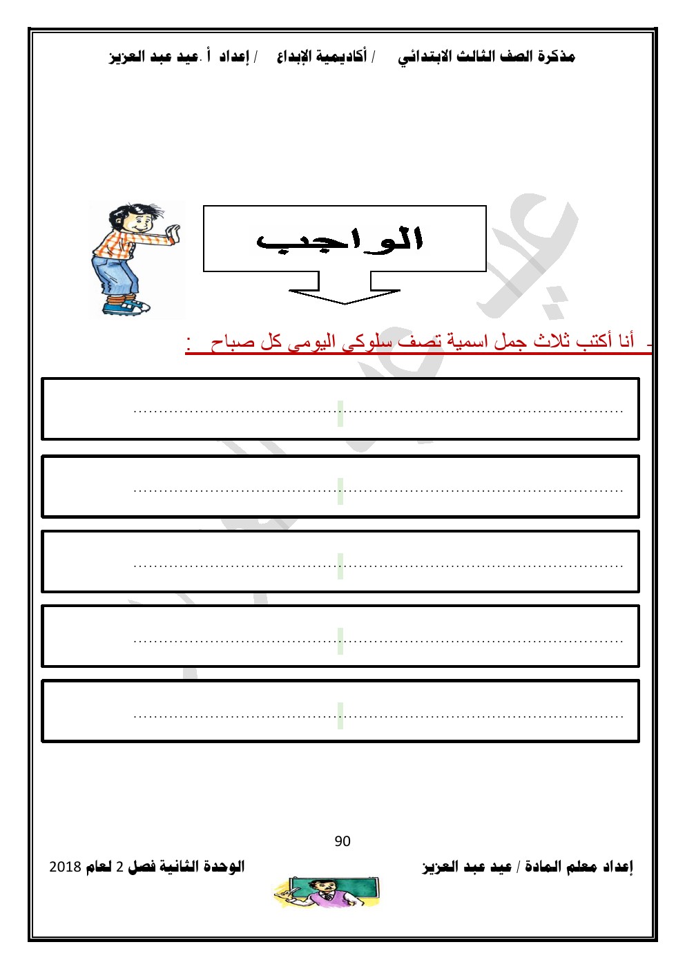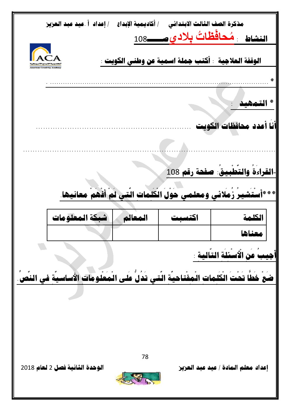 يحتوي الملف على الوحدة الثانية في مادة اللغة العربية للصف الثالث الابتدائي عدد اوراق هذا الملف 98 ورقة للاستاذ عيد عبد العزيز محمد ويتضمن الملف الوحدة الثانية