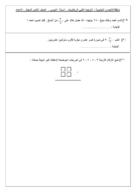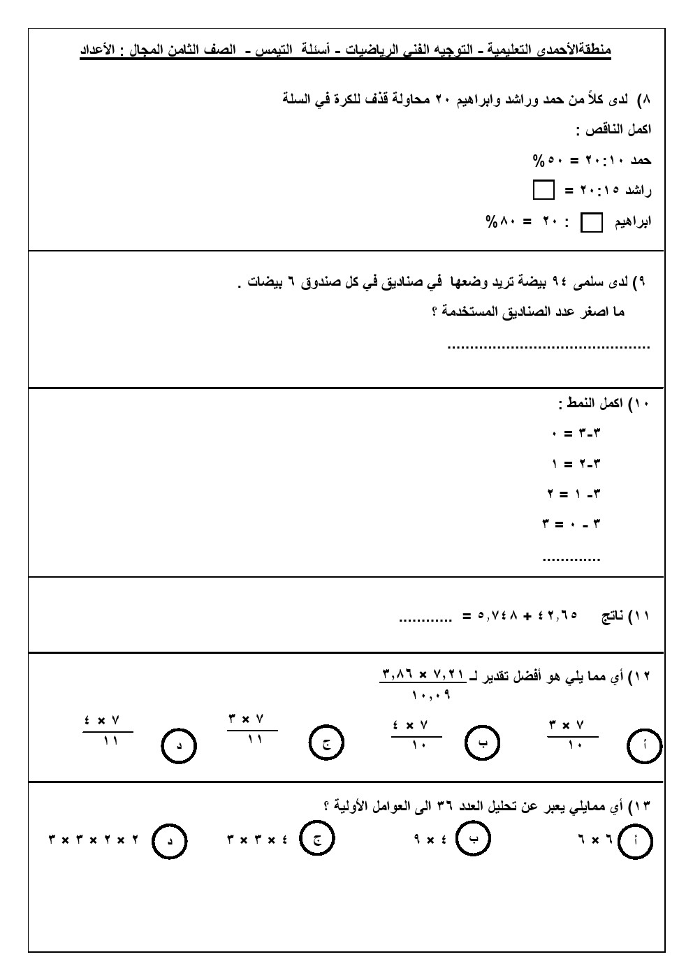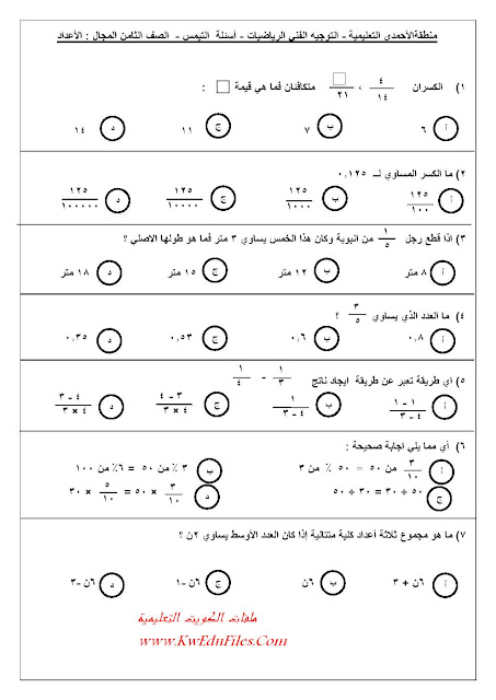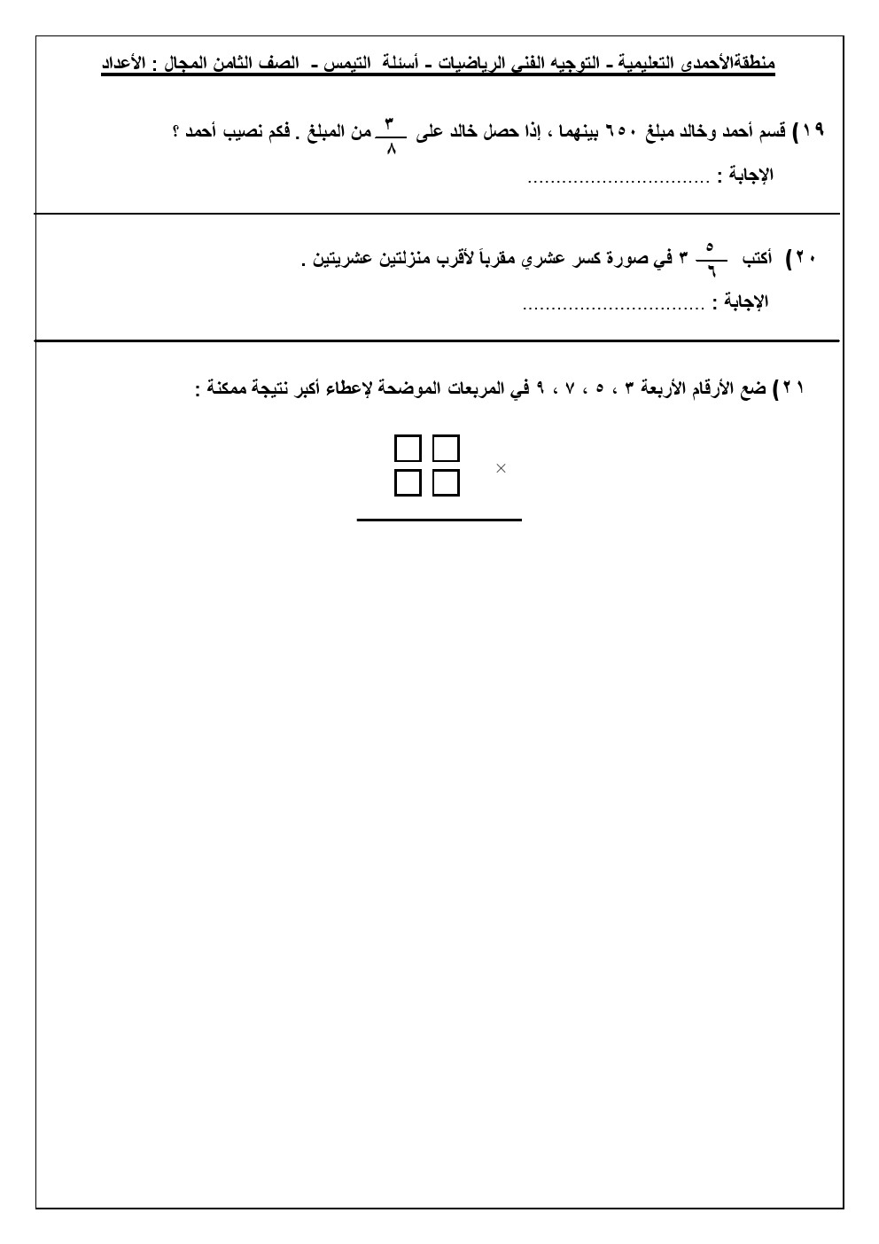 اسئلة التيمس في مادة الرياضيات للصف الثامن للفصل الدراسي الثاني عدد اوراق هذا الملف 4 اوراق وهو تابع للادارة العامة لمنطقة الاحمدي ويتضمن اسئلة التيمس للاعداد