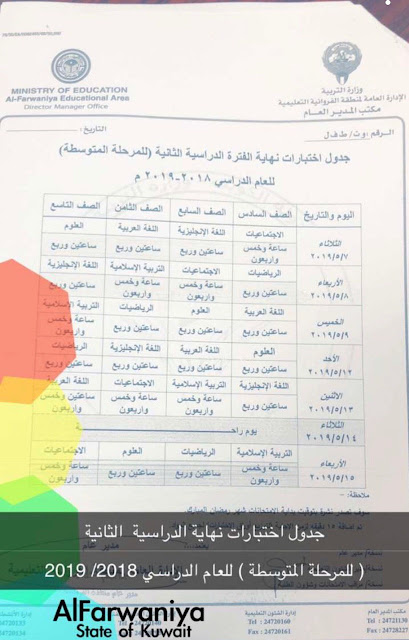 الجدول الجديد لاختبارات الفروانية للمرحلة المتوسطة والصف الخامس فترة ثانية ٢٠١٨/٢٠١٩, منطقة الفروانية التعليمية, أخبار, التربية, الفصل الثاني, 2018-2019 | ||
