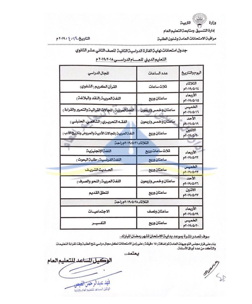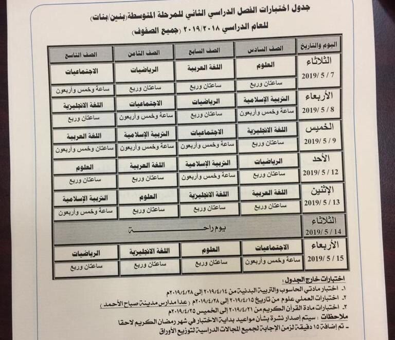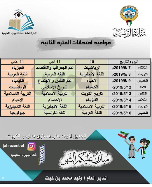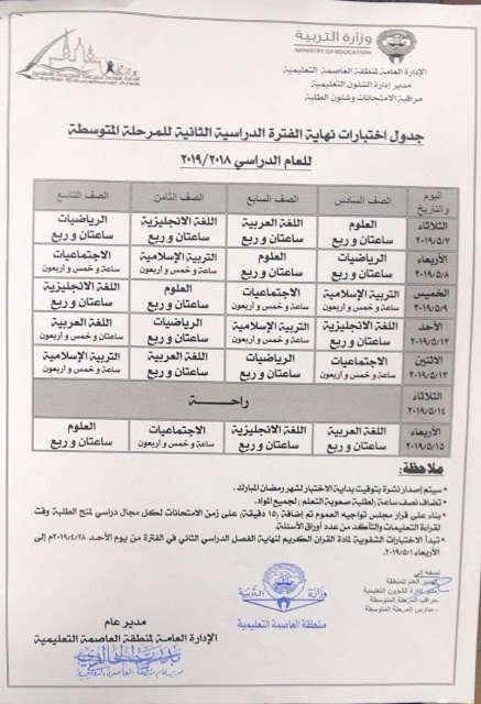 | .إليكم جداول امتحانات جميع المناطق التعليمية بما فيها جداول المرحلة الثانوية في دولة الكويت، الفصل الثاني من العام الدراسي ٢٠١٨/٢٠١٩ | ||||