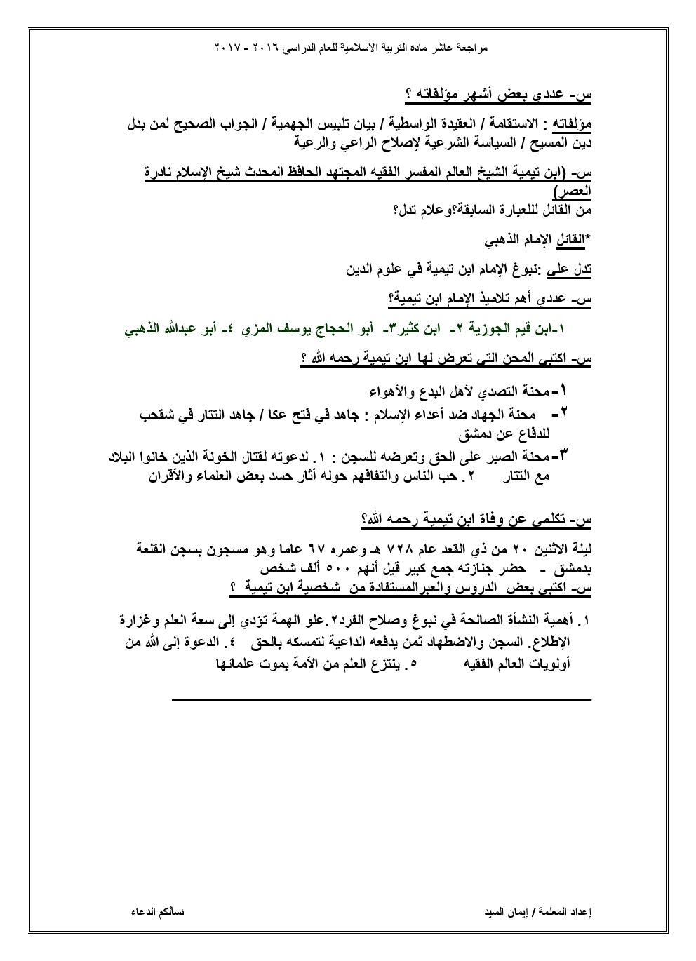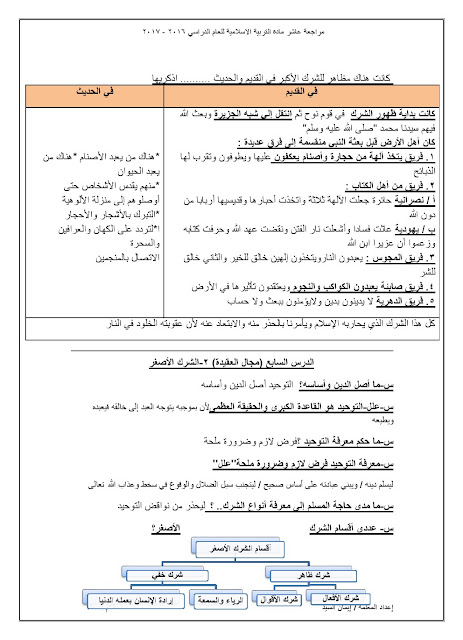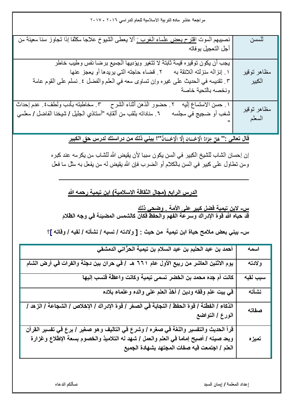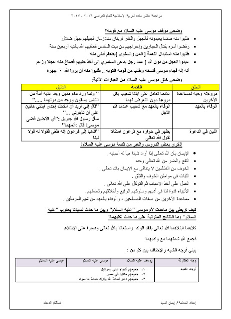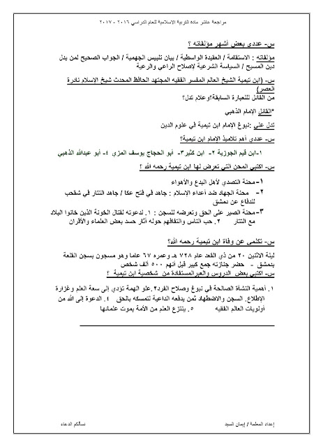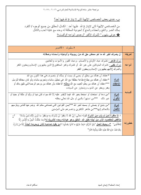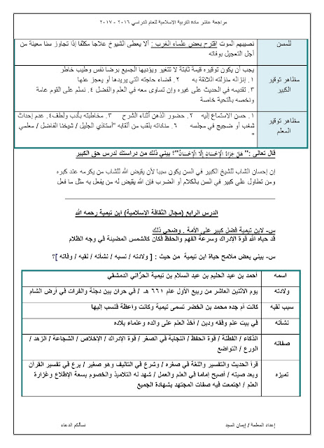 مذكرة شاملة لجميع الدروس, ايمان السيد, الصف العاشر, تربية اسلامية, الفصل الثاني, 2017-2018 - المناهج الكويتية