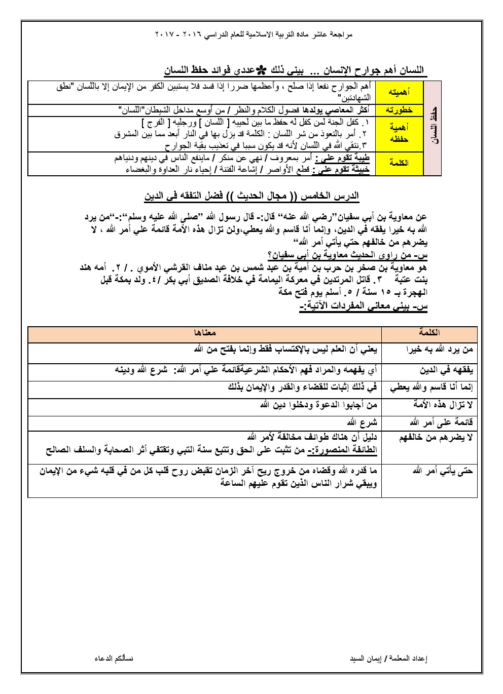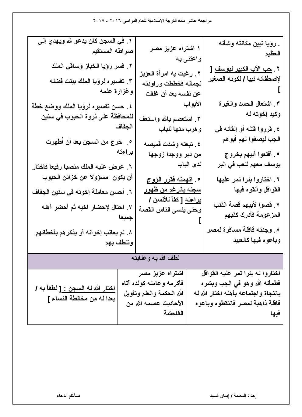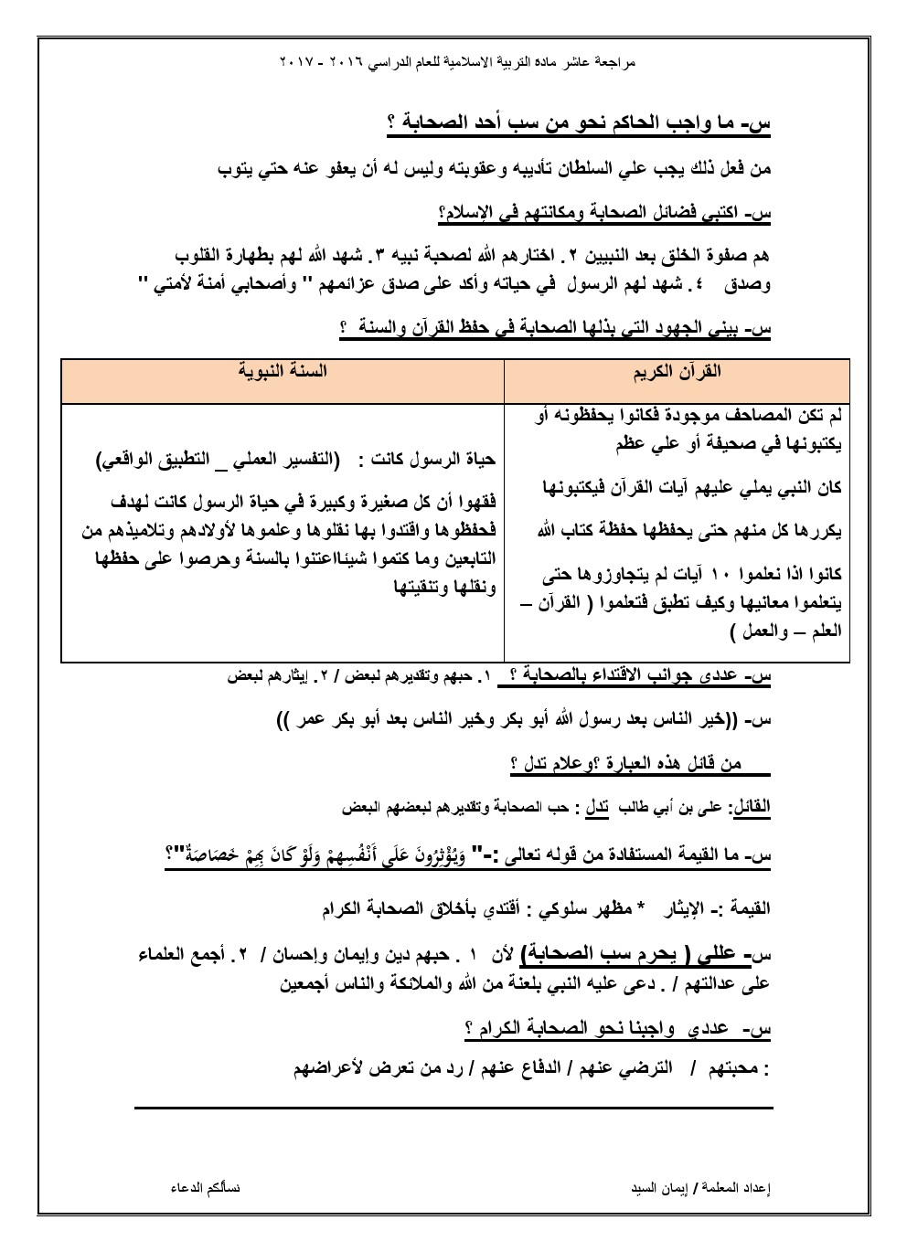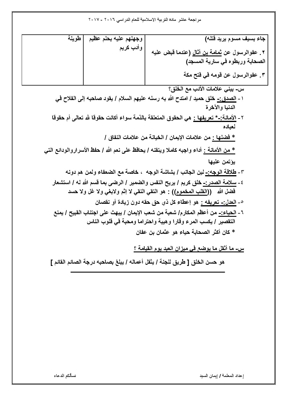 مذكرة شاملة لجميع الدروس, ايمان السيد, الصف العاشر, تربية اسلامية, الفصل الثاني, 2017-2018 - المناهج الكويتية