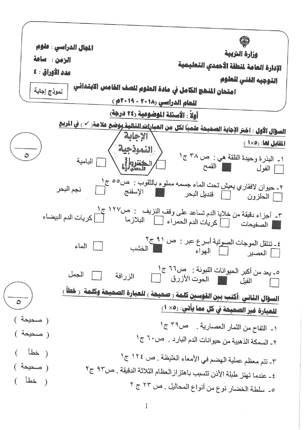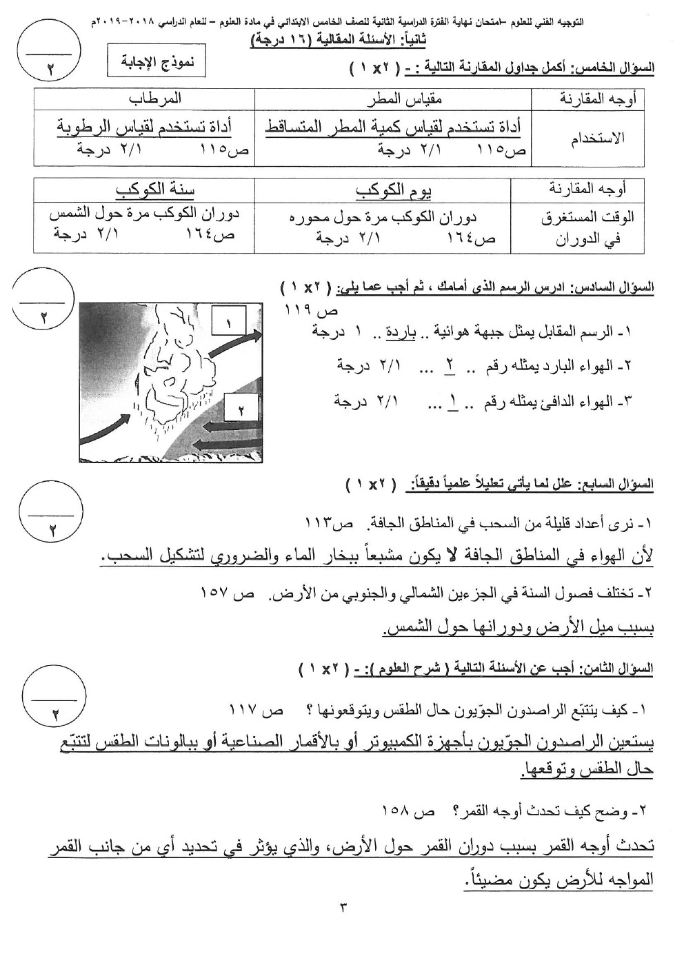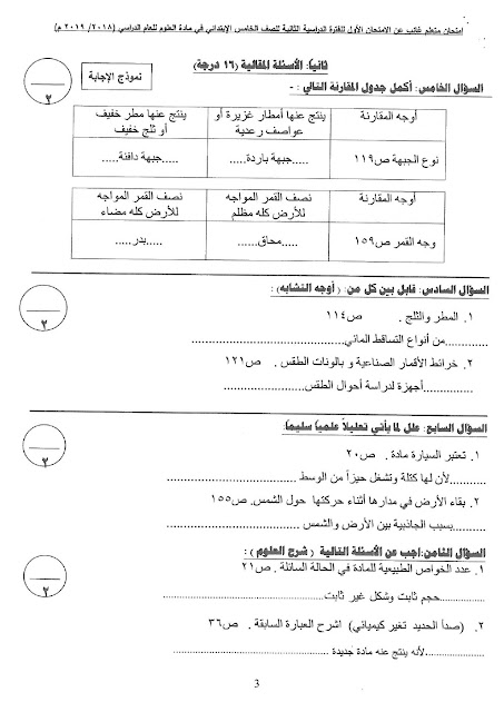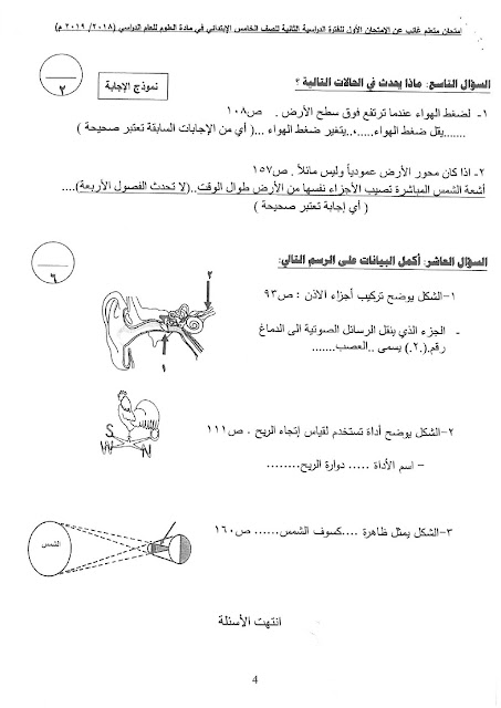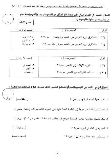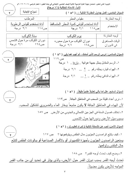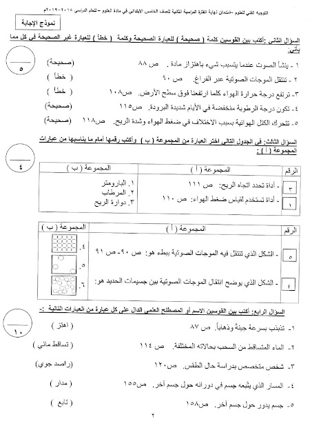 إليكم الاجابة النموذجية في مادة العلوم للصف الخامس لامتحان الفصل الثاني من العام الدراسي 20182019