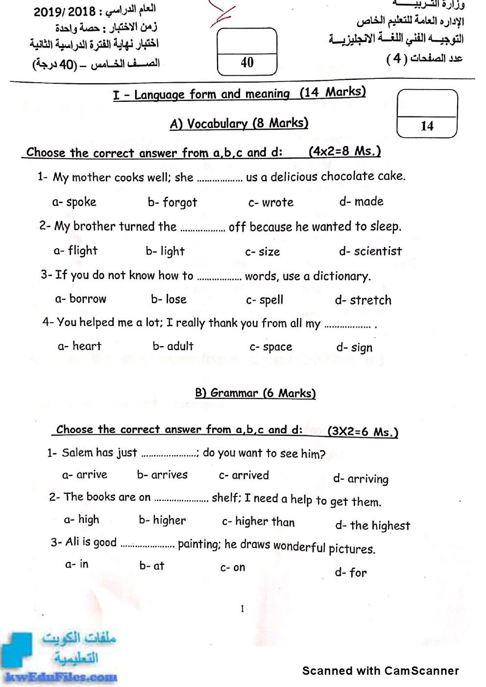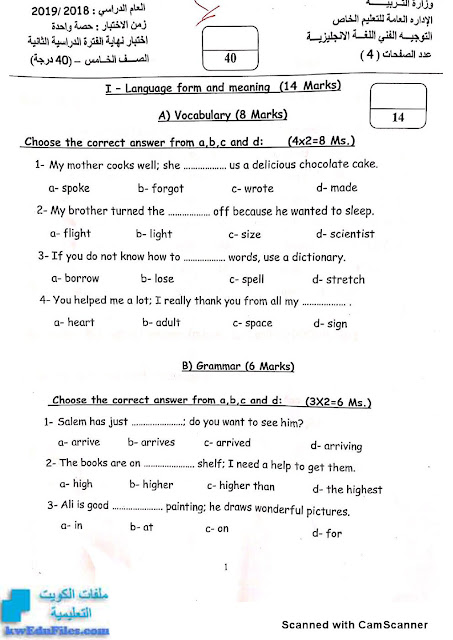 اليكم اسئلة التعليم الخاص في مادة اللغة الانجليزية - الاختبار الرسمي لامتحان نهاية الفصل الثاني من العام الدراسي 2018/2019