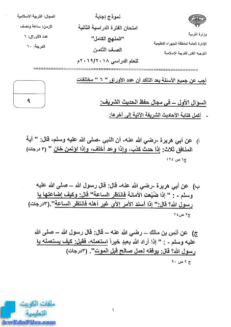 4. نموذج إجابة منطقة الجهراء التعليمية