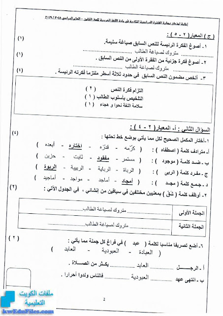 8. الصف الخامس, رياضيات, نماذج الاختبارات التحصيلية الثانية