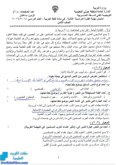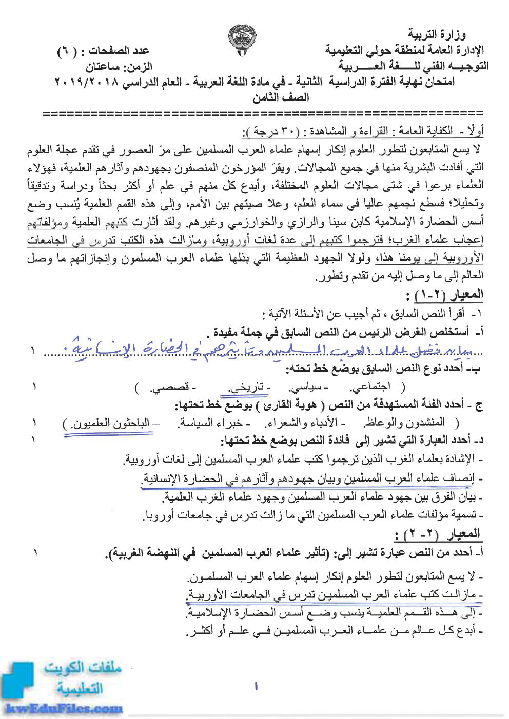 إليكم نموذج اجابة منطقة حولي - الصف الثامن - امتحان الفصل الثاني 2018/2019