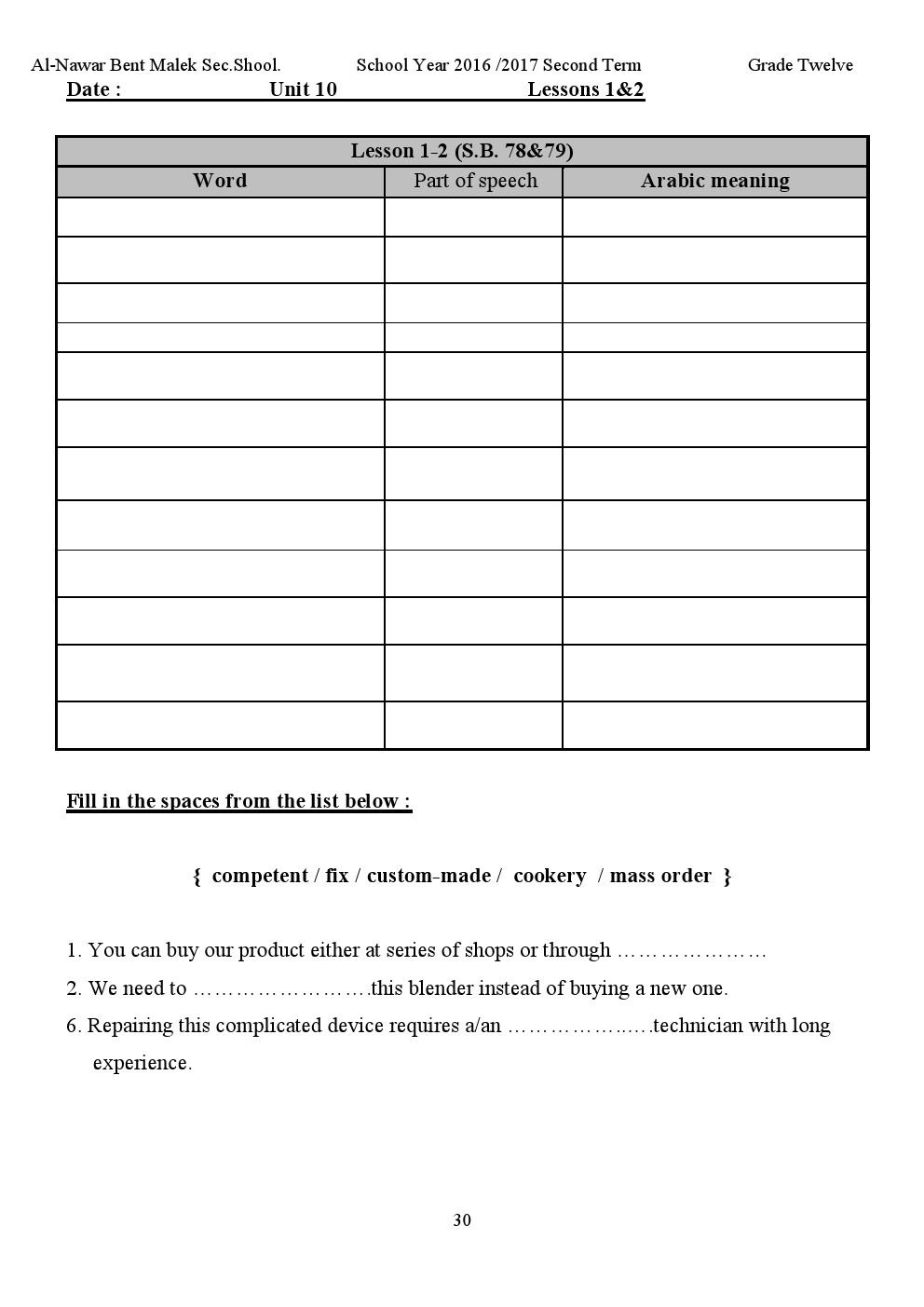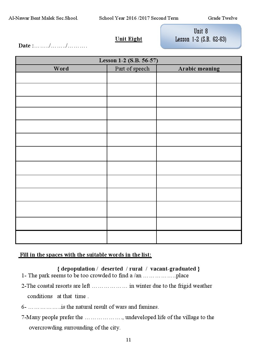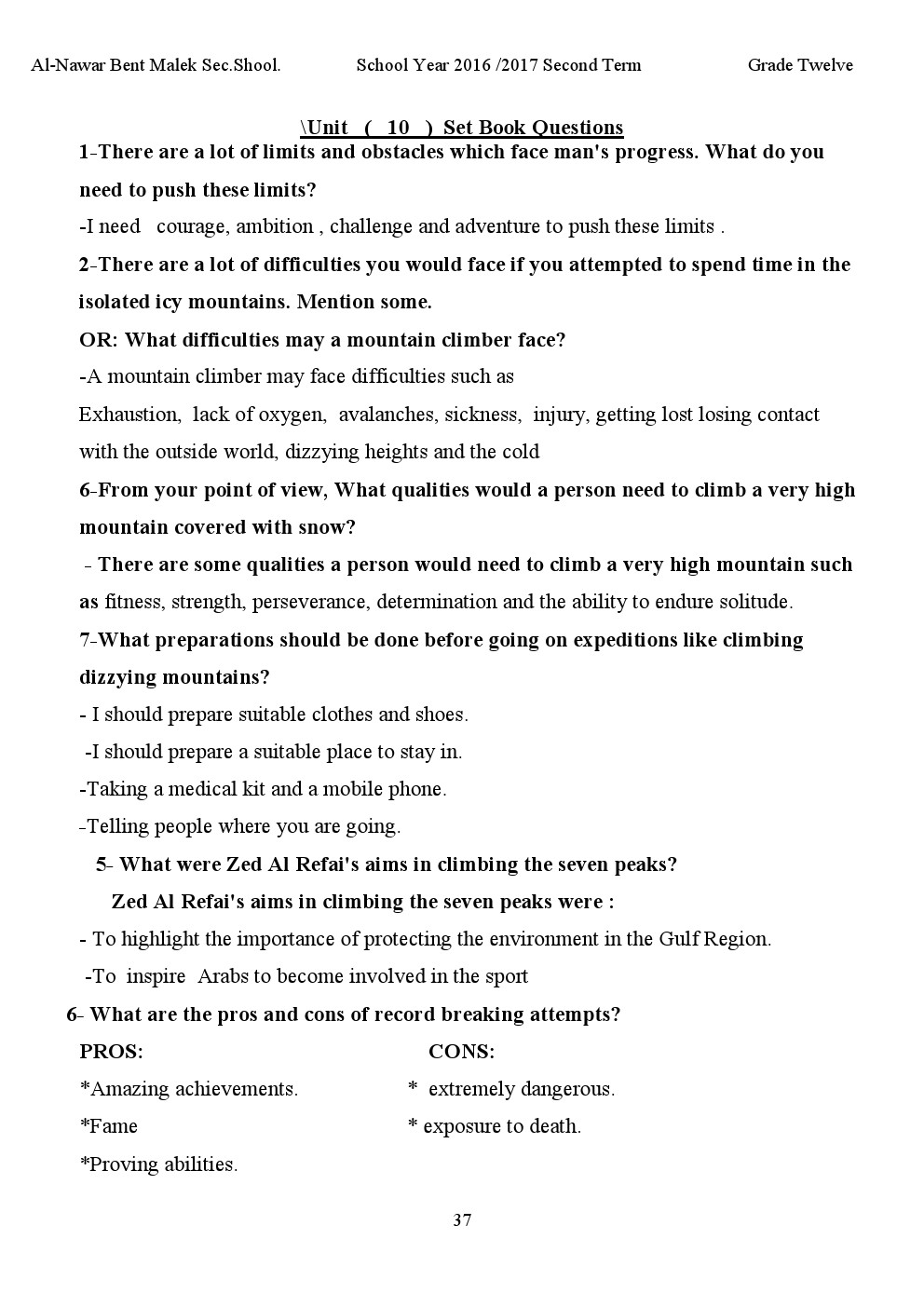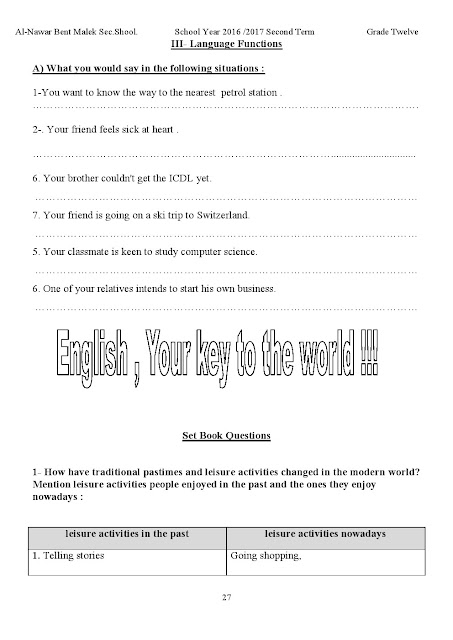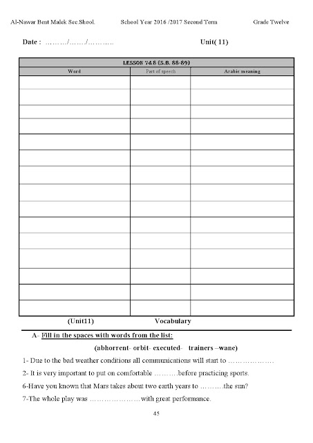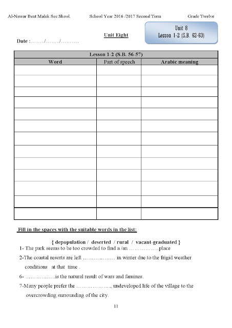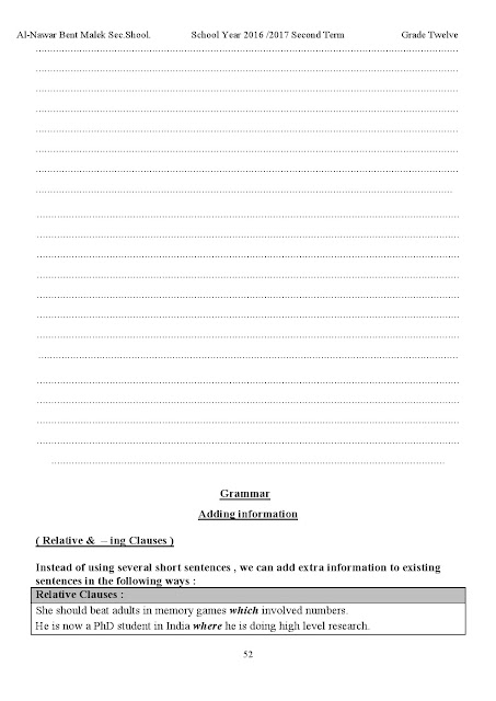معلومات الملف: مذكرة في اللغة الانكليزية للصف الثاني عشر الفترة الدراسية الثانية عدد الاوراق المتعلقة بها 76ورقة ويتضمن الوحدات التالية: Unit 7: Long lives *Unit 8: Lessons *Unit 9:Lessons *Unit 10: Set Book Questions *Unit11:Set Book Questions *Unit 12: Lessons | ||