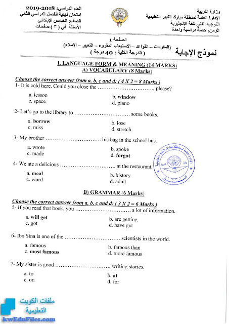 معلومات الملف: اليكم نموذج اجابة اللغة الانجليزية امتحان نهاية الفصل الثاني 20182019 | ||