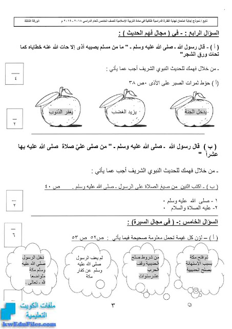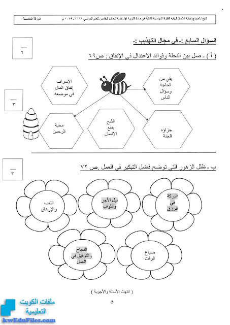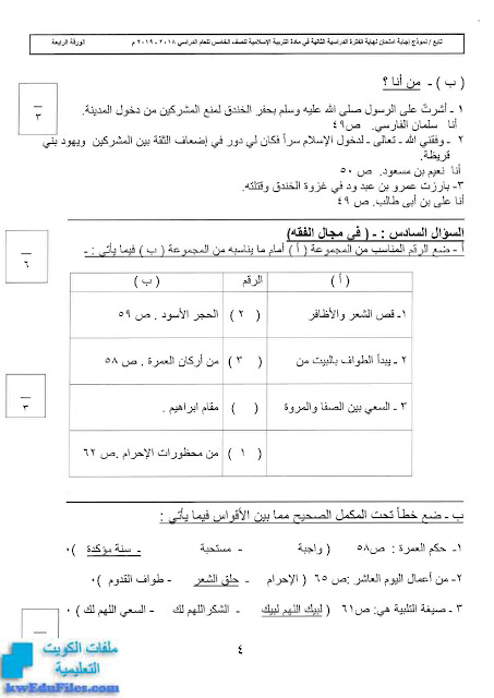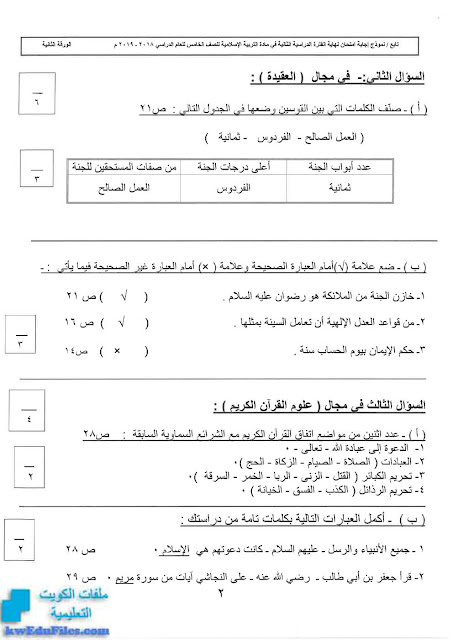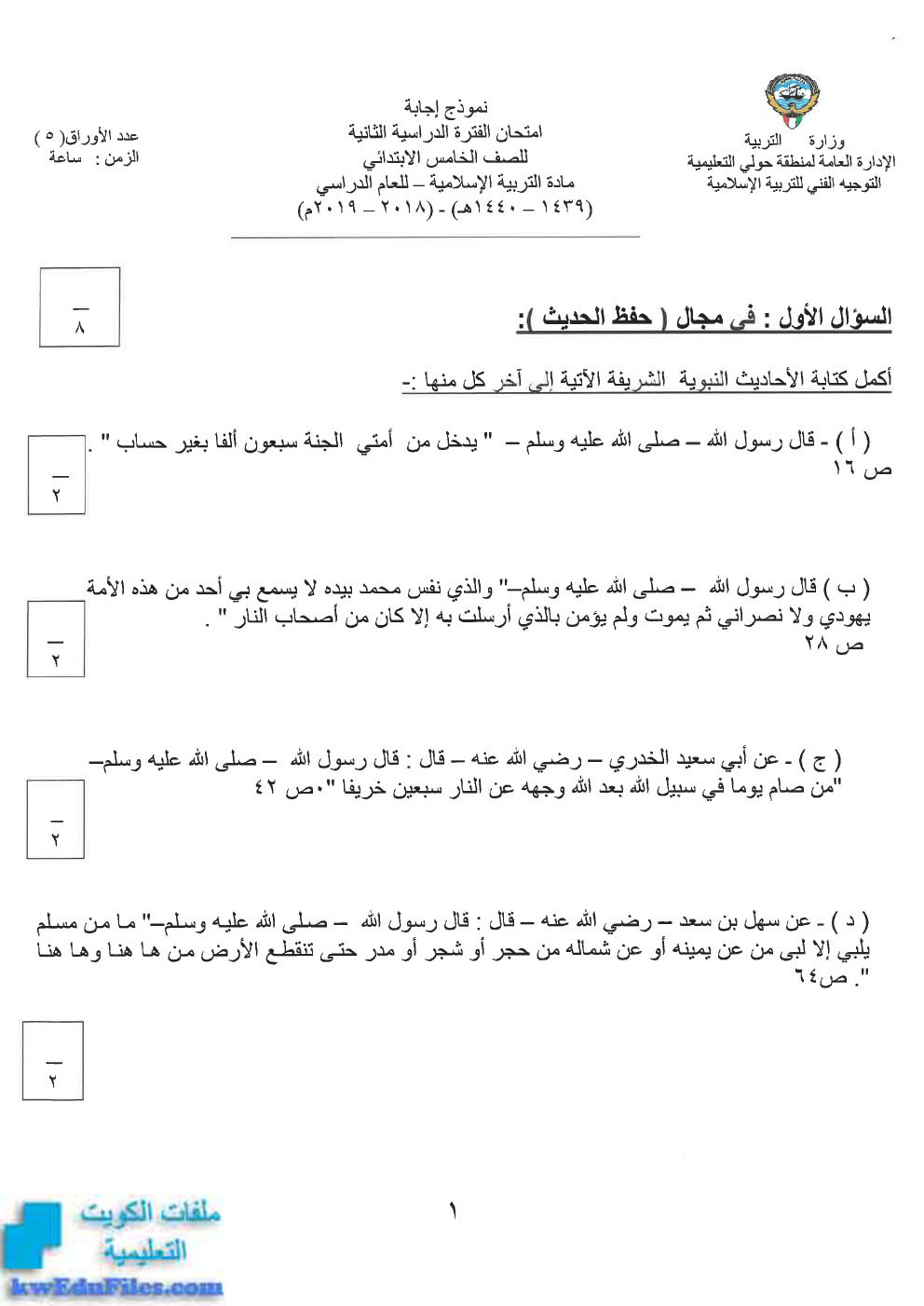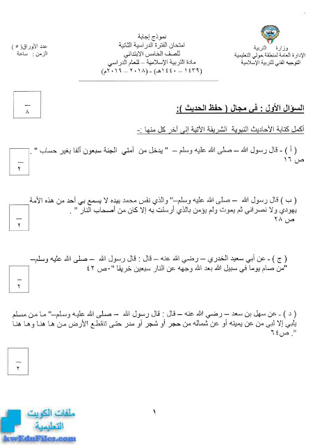 نموذج اجابة منطقة حولي في مادة التربية الاسلامية - امتحان نهاية الفصل الثاني 20182019