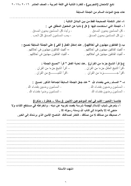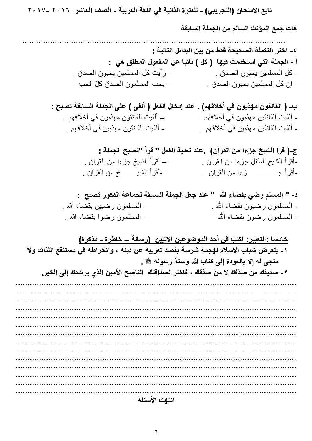 معلومات الملف: امتحان تجريبي في مادة اللغة العربية للصف العاشر للفصل الدراسي الثاني عدد اوراق هذا الملف 6 اوراق ويتضمن نموذج 3 | ||