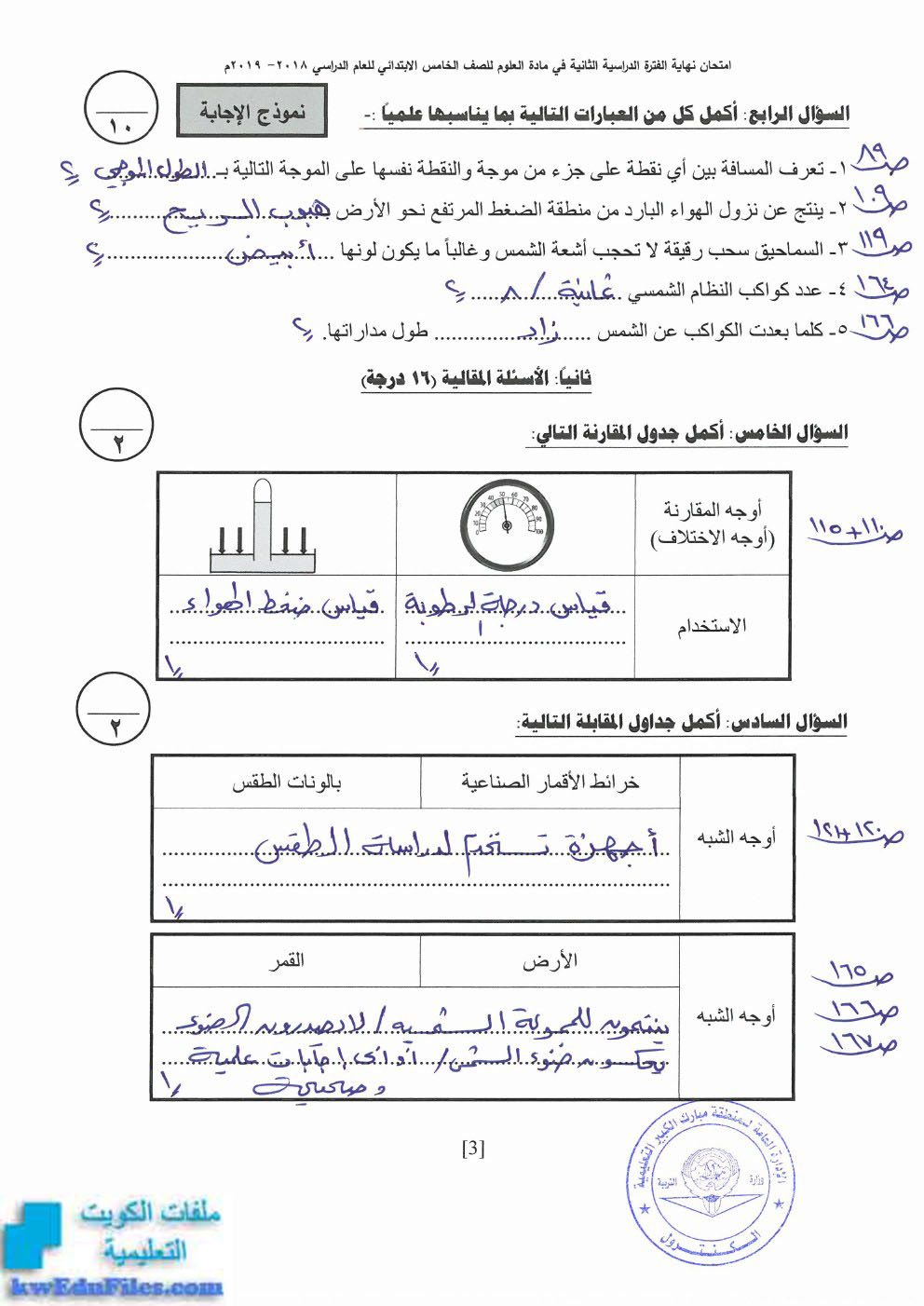 معلومات الملف: نموذج اجابة منطقة مبارك الكبير التعليمية في مادة العلوم | ||