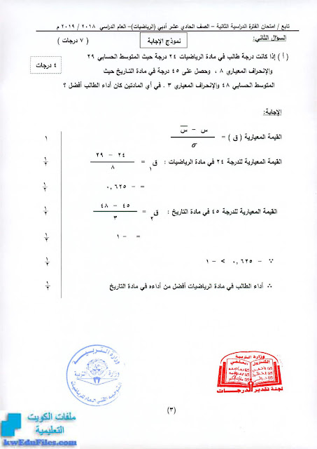 15. إحصاء, الفصل الثاني, 2024-2025, إجابة الاختبار الرسمي المعتمد من التوجيه الفني العام