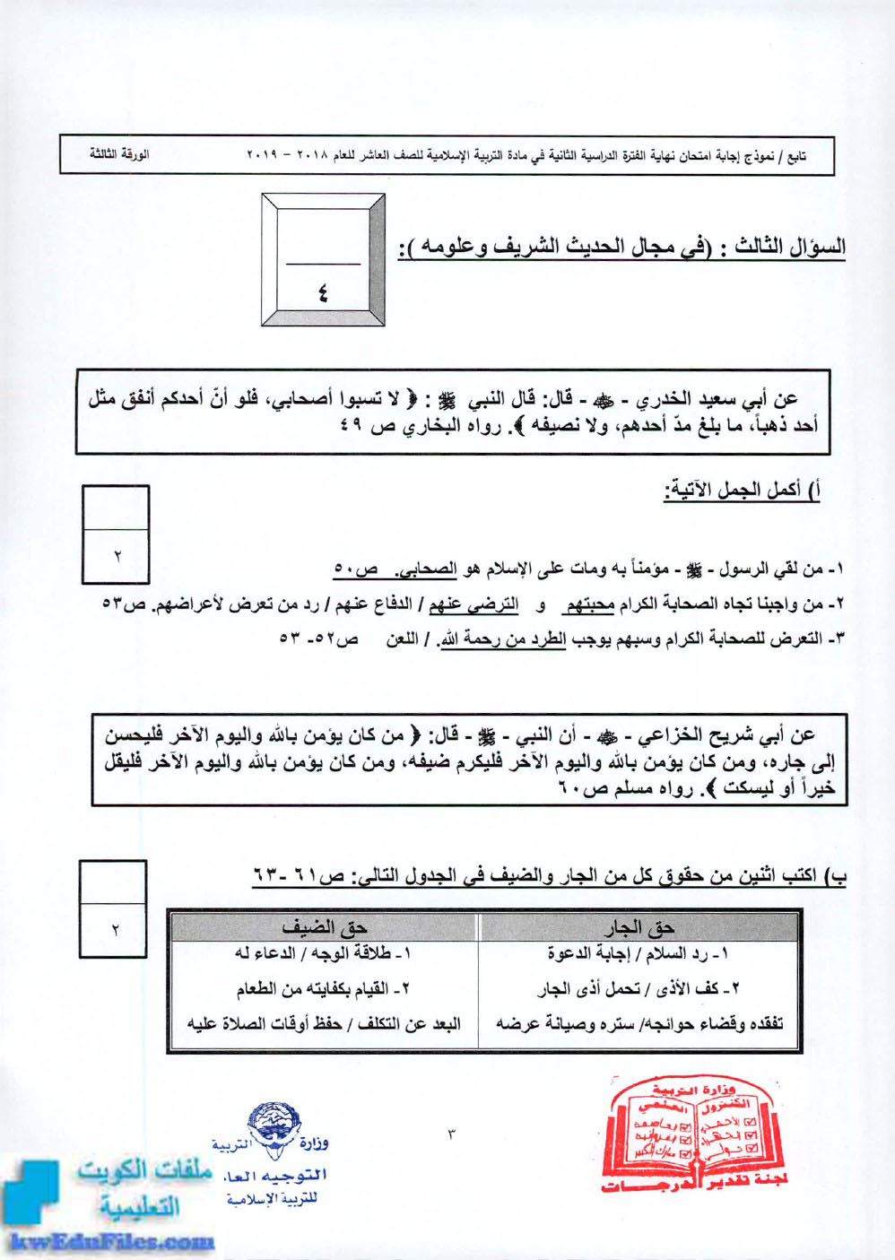 نموذج إجابة, الصف العاشر, تربية اسلامية, الفصل الثاني, 2018-2019 - المناهج الكويتية