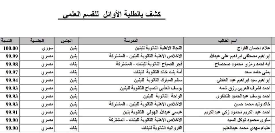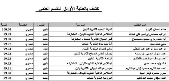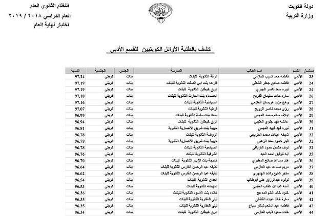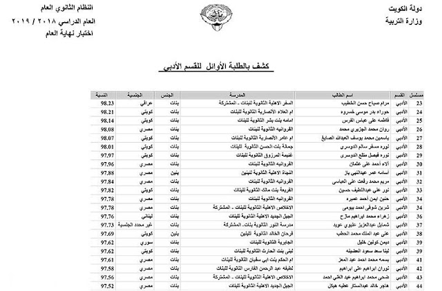 كشف الطلبة الأوائل للقسم الأدبي - روان عاطف يونس الأولى بنسبة 99.74% أسماء الكويتيين الـ 50 الأوائل على القسم الأدبي - الأولى أنوار خالد جاسم بنسبة (98.95%) | ||
