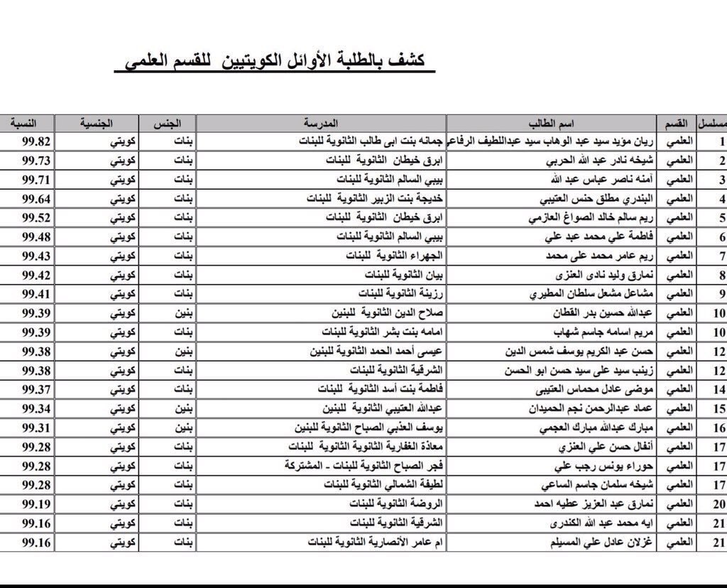 | كشف الطلبة الأوائل للقسم الأدبي - روان عاطف يونس الأولى بنسبة 99.74% أسماء الكويتيين الـ 50 الأوائل على القسم الأدبي - الأولى أنوار خالد جاسم بنسبة (98.95%) | ||