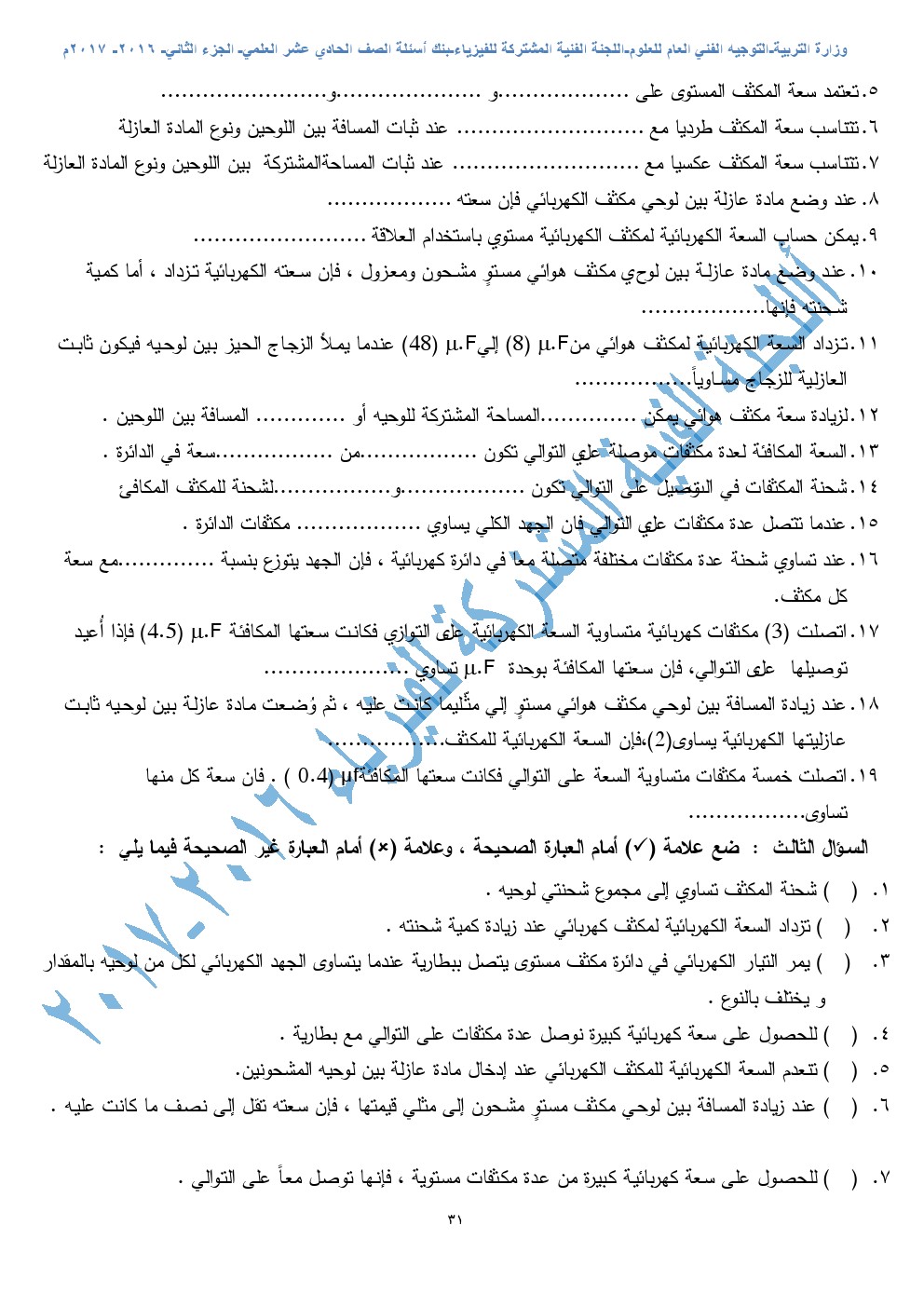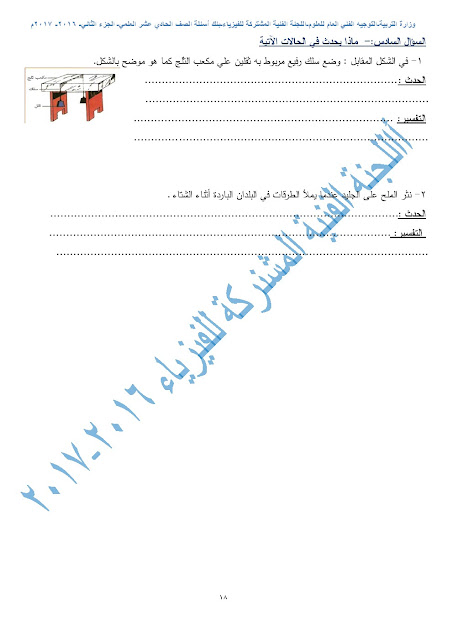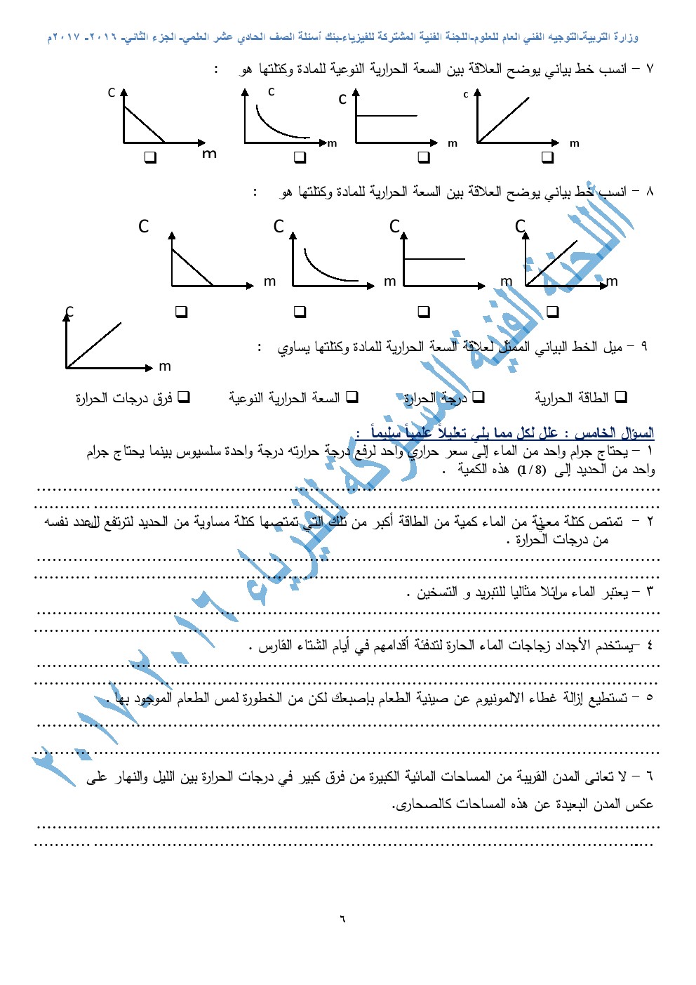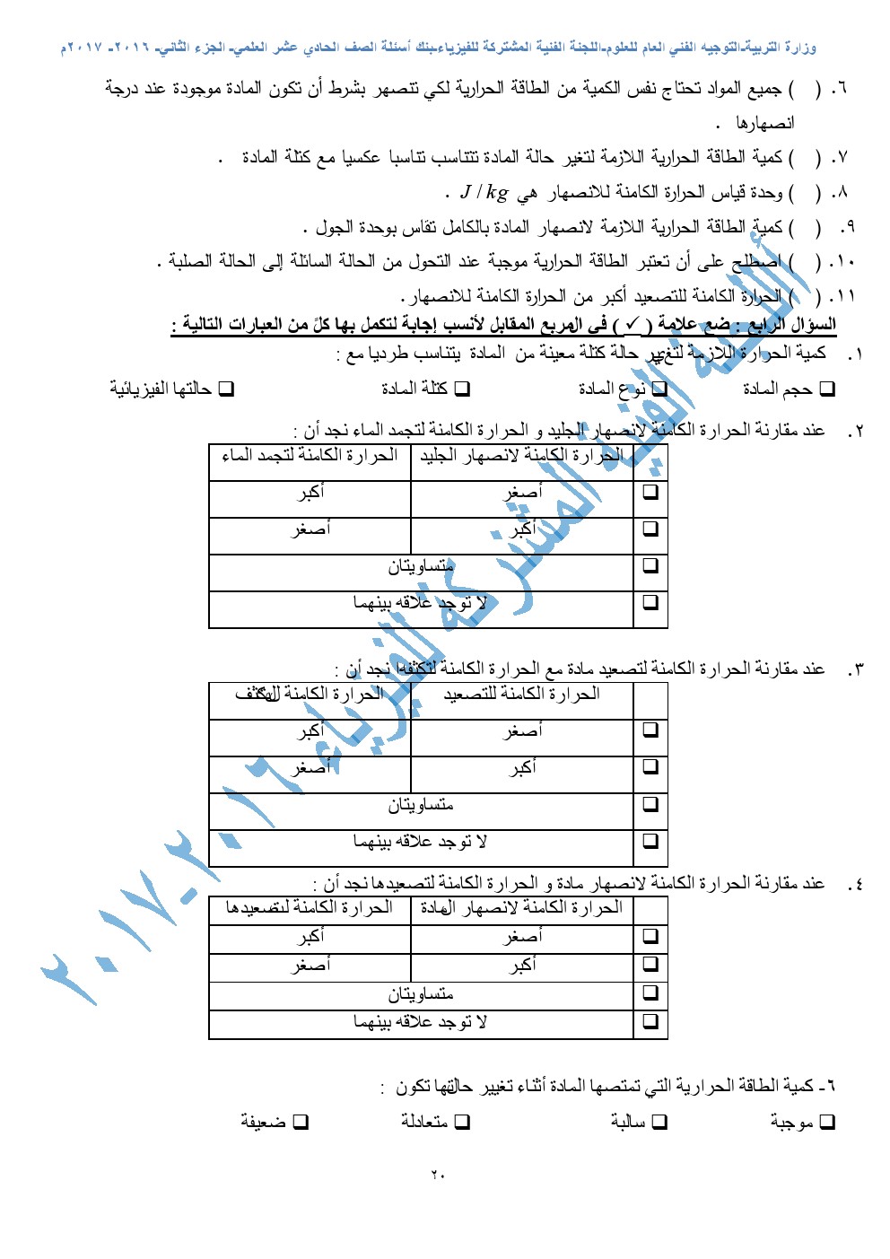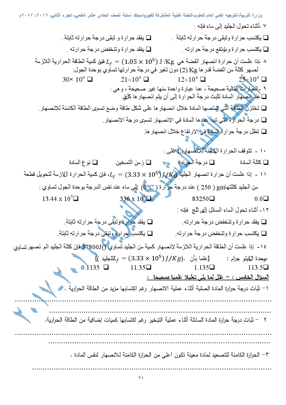 بنك اسئلة التوجيه في مادة الفيزياء للصف الحادي عشر العلمي للفصل الدراسي الثاني عدد اوراق هذا الملف 58 ورقة ويتضمن الحرارة والاتزان الحراري والقياسات الحرارية والتمدد الحراري وكذلك التبخر والتكاثف والغليان والتجمد ووحدة الكهرباء وغيرها