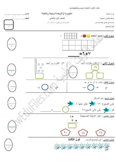 معلومات الملف: إليكم ملف مكون من صفحتين يحوي اختبار في الرياضيات للصف الاول وهو من مدرسة ابن خلدون