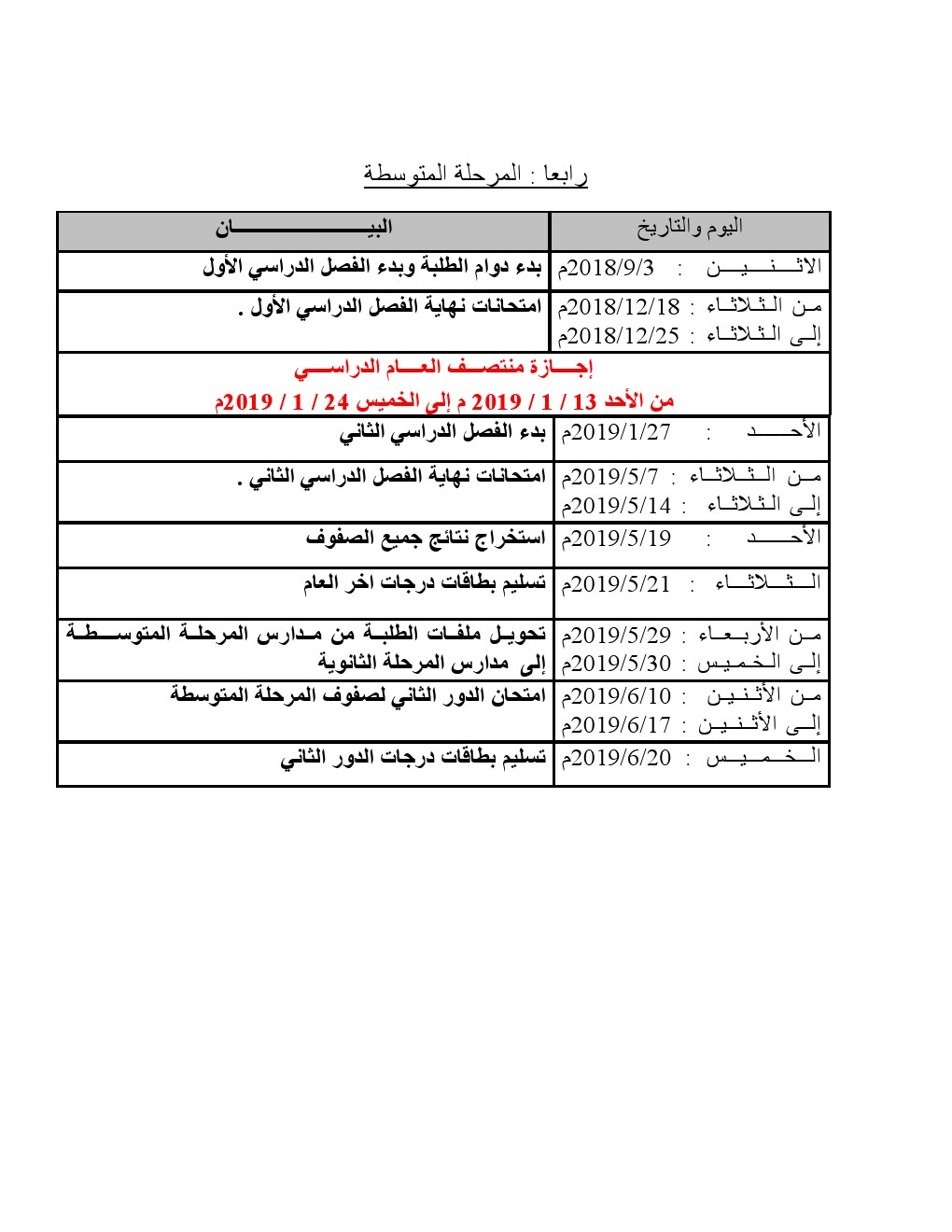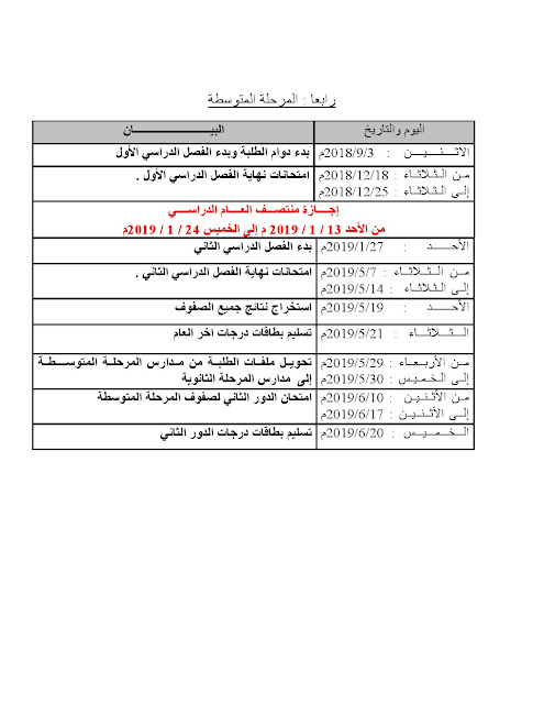 يحتوي الملف على التقويم الدراسي للمرحلة الابتدائية والمتوسطة وايضا المرحلة الثانوية لعام 2018_2019_عدد أوراق هذا الملف 6 اوراق | ||||