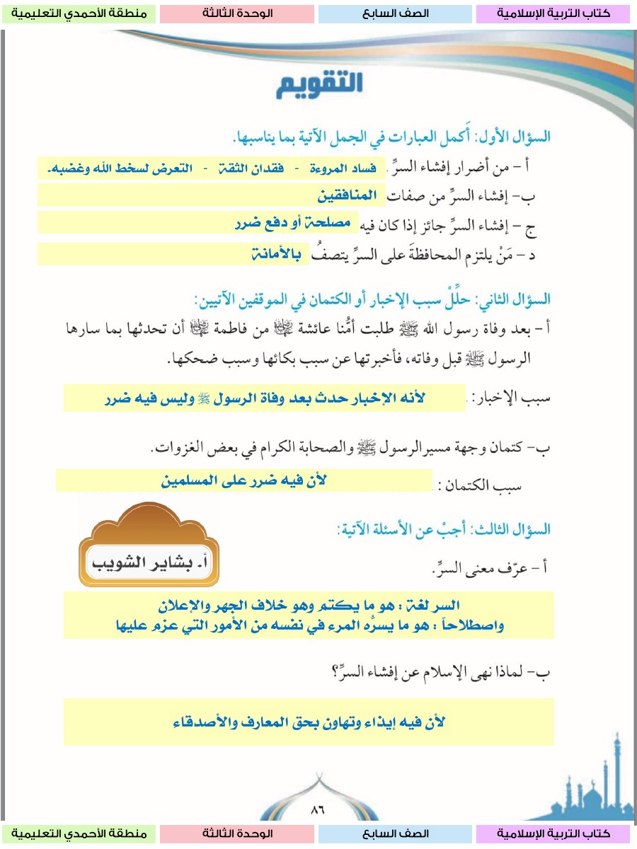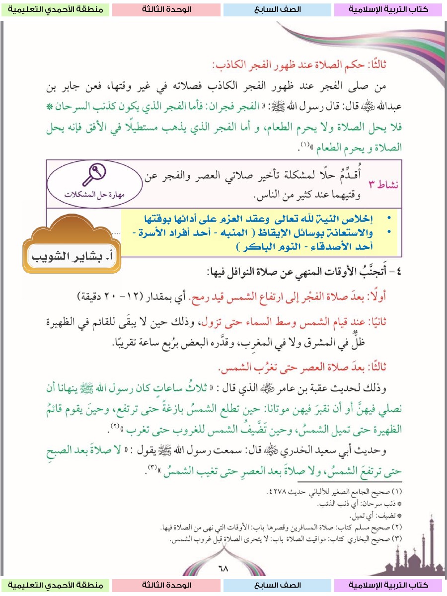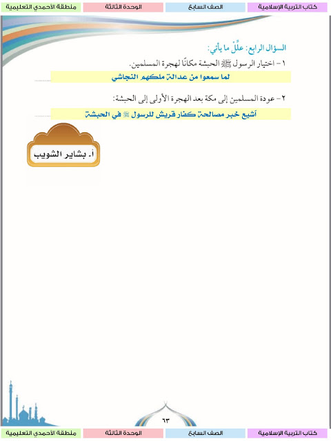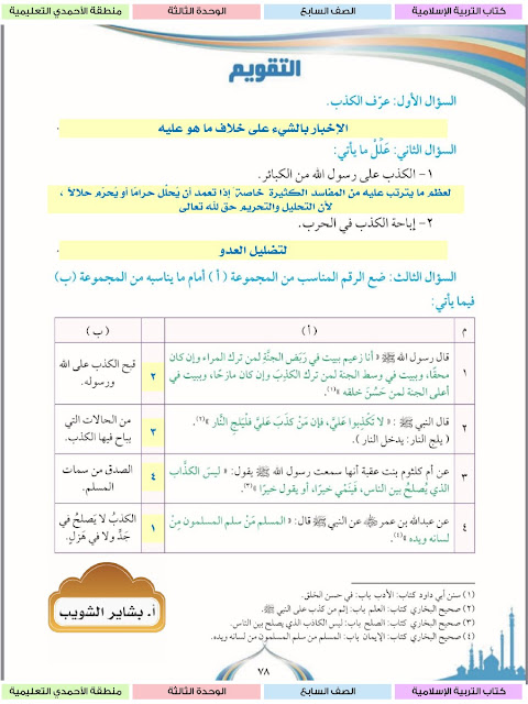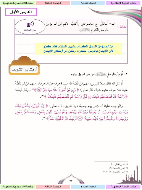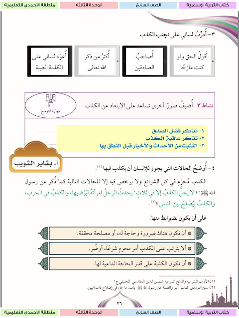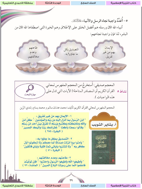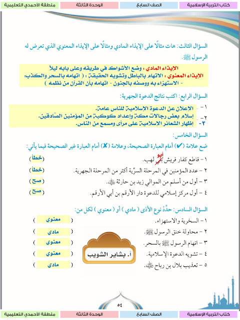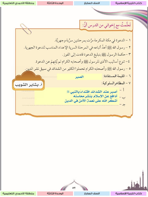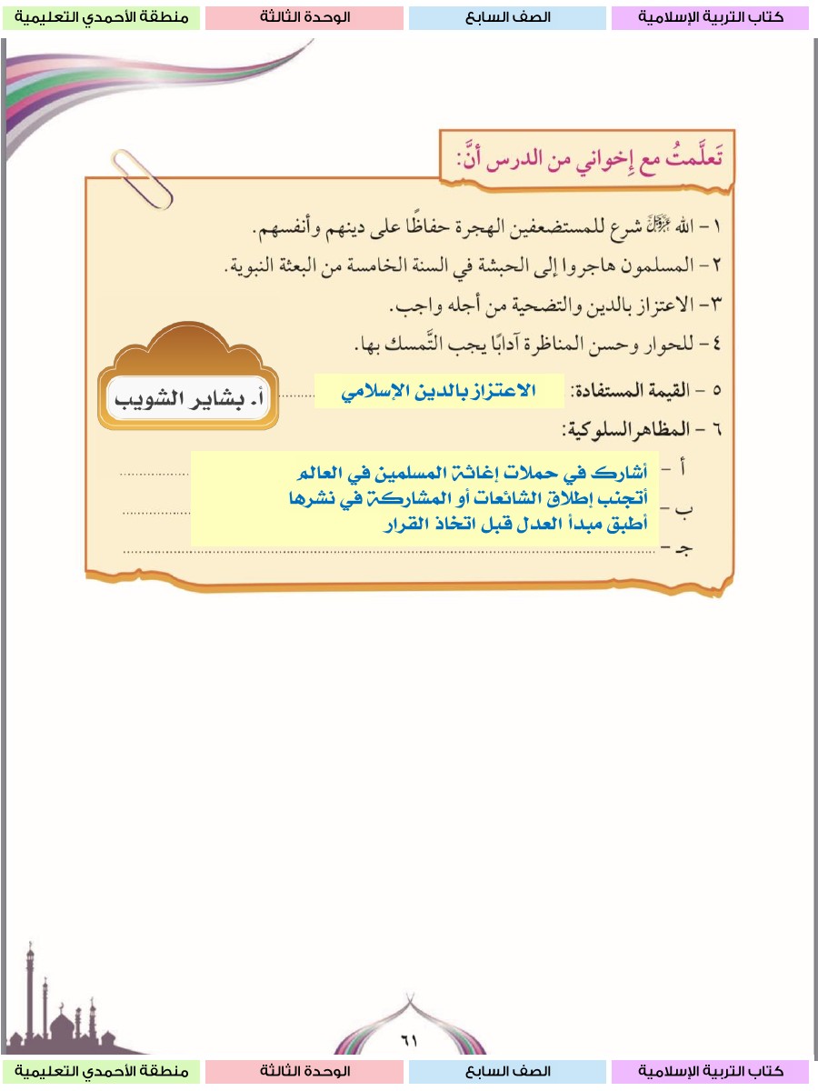 حل الوحدة الثالثة كاملة مع الاجابة للتربية الاسلامية