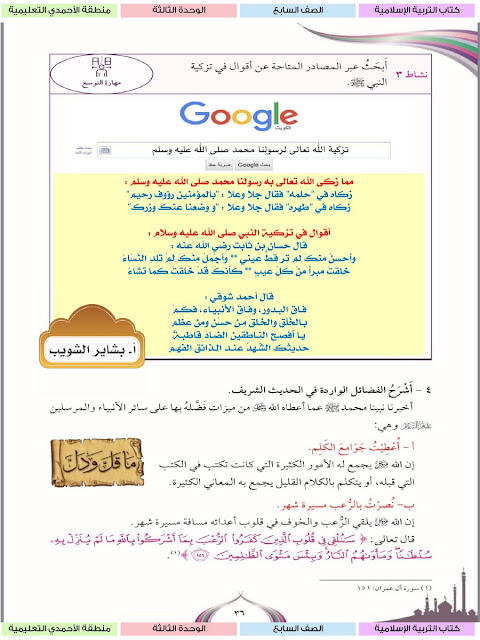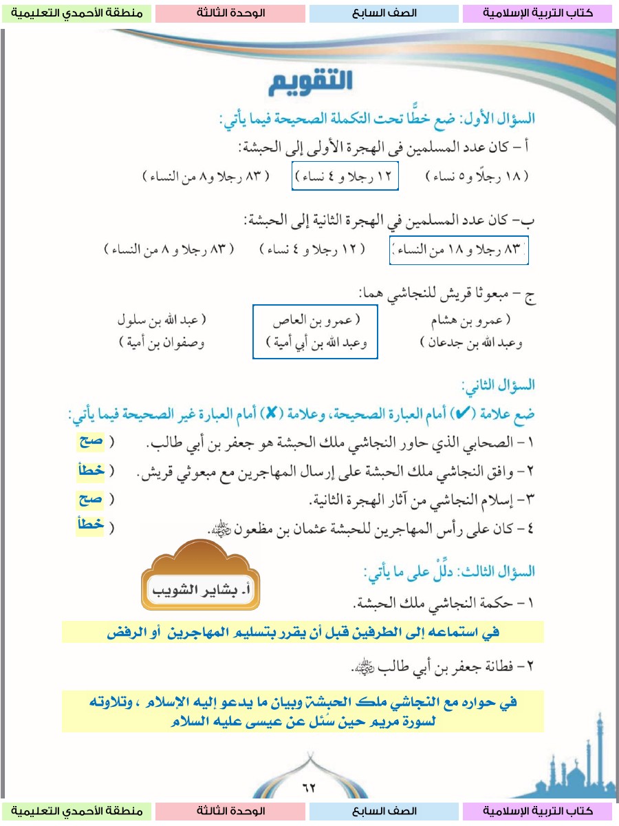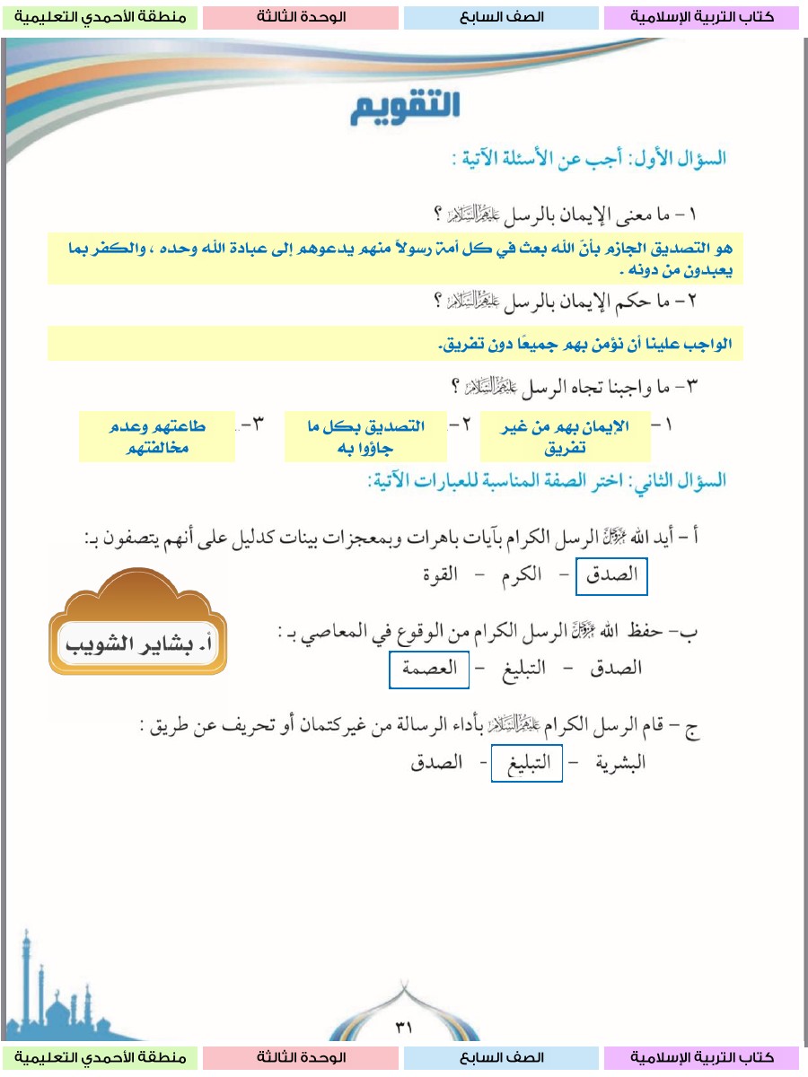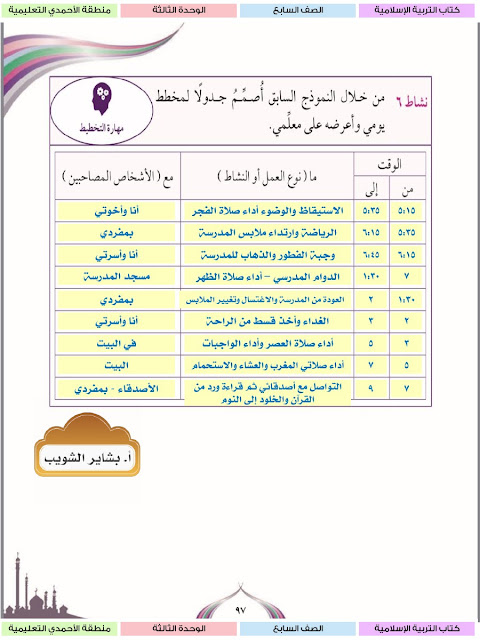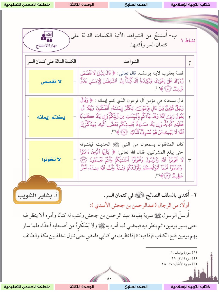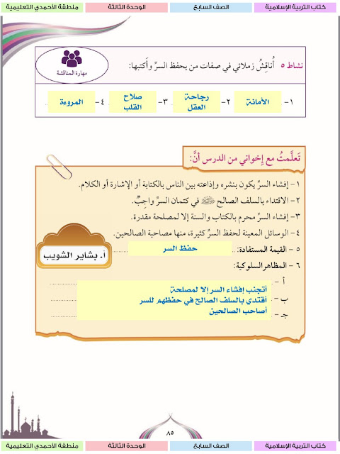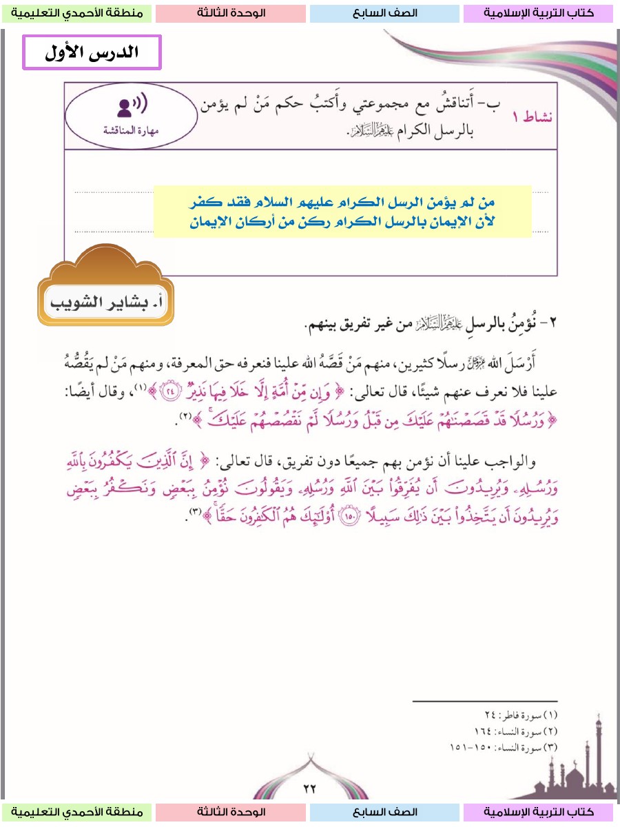 حل الوحدة الثالثة كاملة مع الاجابة للتربية الاسلامية