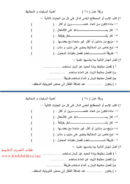 معلومات الملف: ورقة عمل في مادة العلوم للصف السابع للفصل الدراسي الثاني عدد اوراق هذا الملف ورقة واحدة ويتضمن ورقة عمل 24 أهمية المركبات والمخاليط | ||