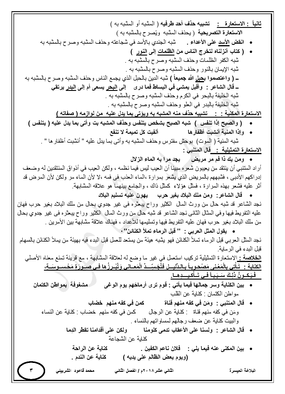 البلاغة الميسرة للصف الثاني عشر شاملة ومختصرة وبسيطة في ست عشرة صفحة