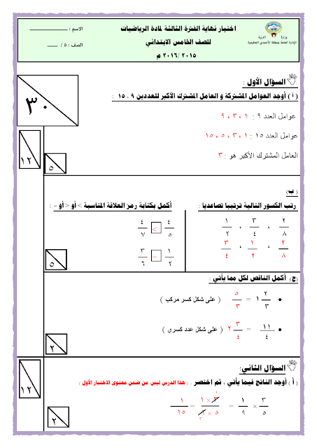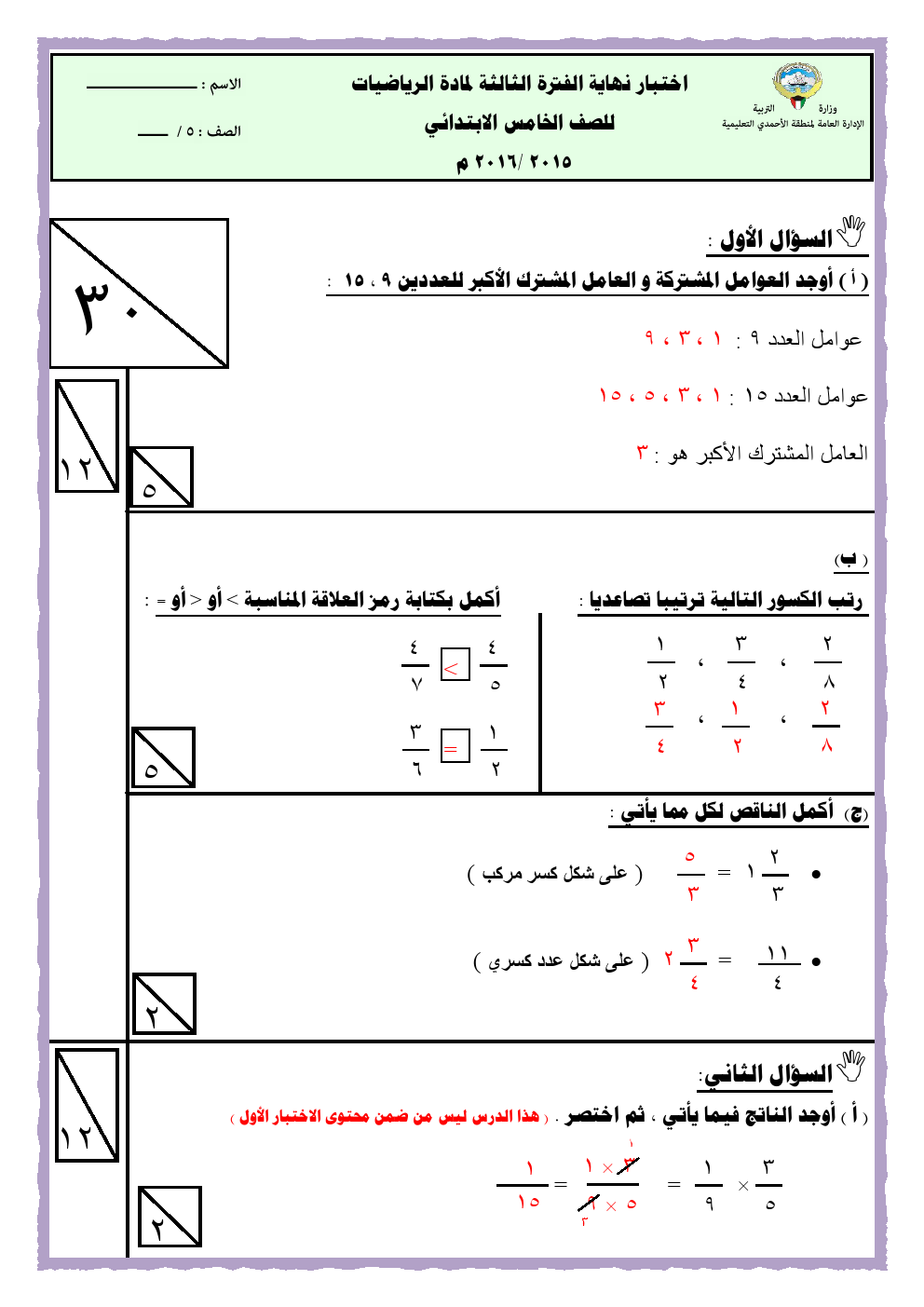 معلومات الملف: تدريبات _نموذج اختبار مع نموذج الاجابة للصف الخامس في مادة الرياضيات في خمس عشرة صفحة | ||